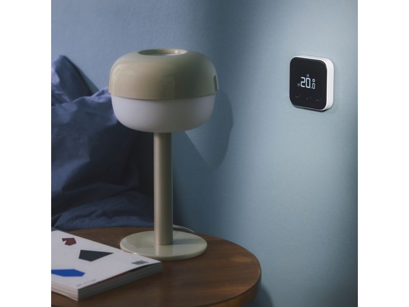 Internetttilkobling: Termostaten kobles til internett via Bridge X, som kobles til en stikkontakt og kobles til en Wi-Fi-ruter; anbefaling: 1× Bridge X per 100 m² (andre Matter/Thread-enheter kan utvide rekkevidden)