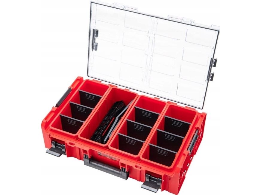 QBRICK SYSTEM ONE Organizer 2XL RED Ultra HD: Ultra HD material; 4 x Multifunctional, tall containers (3 x adjustable dividers, internal dimensions - 313 x 113 x 136 mm), Polycarbonate lid, Durable latches, Solid handles, Seal on lid, Water& Dust protection, Modular construction, Reinforced construction, polyamide connectors for smaller organizer models (M, M Plus and L) + QS ONE Connect Adapters (2 pcs.); stable and secure fixing of the organizers and toolboxes in the vertical position (walls of the workshop, of the bus) with a maximum load capacity of 15 kg or in the horizontal position (floor/shelf of the workshop, of the van) with a maximum load capacity of 50 kg