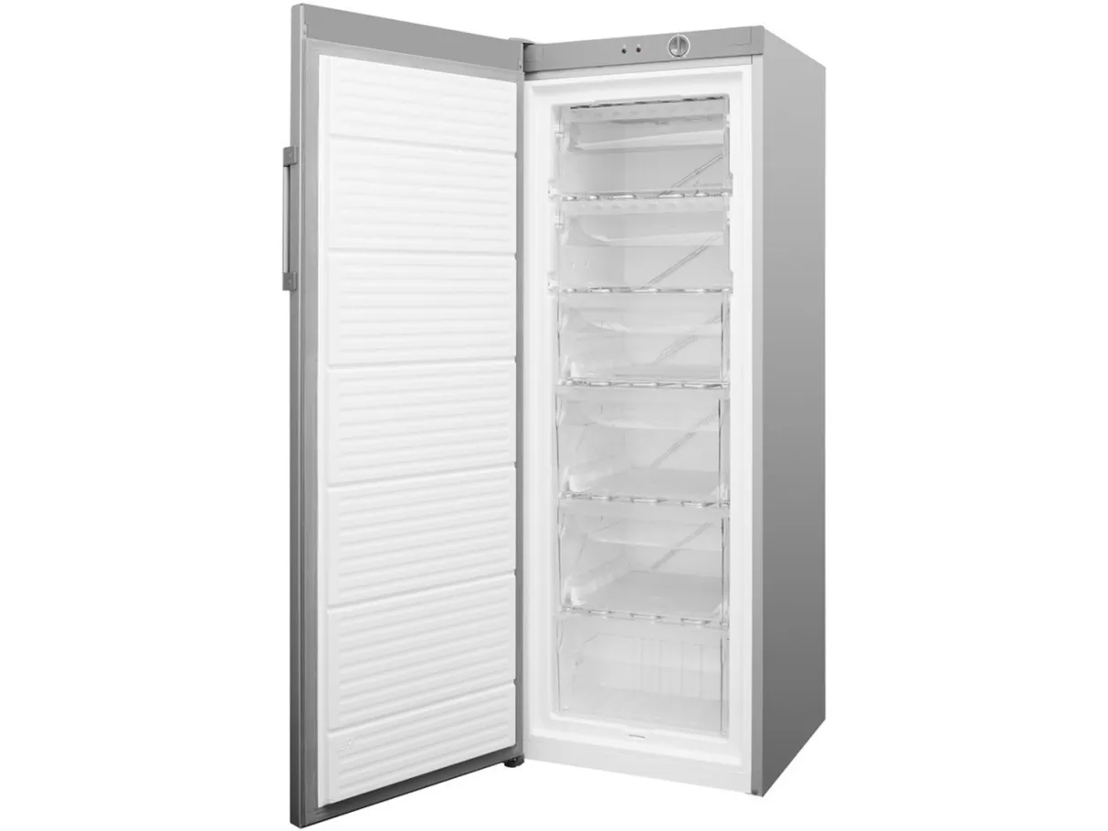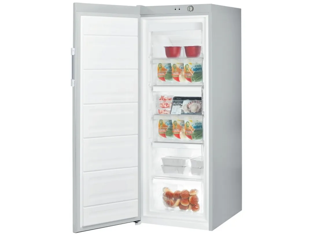 Indesit UI6 2 S. Freezer net capacity: 245 L, Freezing capacity: 12 kg/24h, Noise level: 35 dB, Star rating: 4*. Door hinge: Left. Energy efficiency class: E, Annual energy consumption: 215 kWh. Product colour: Silver