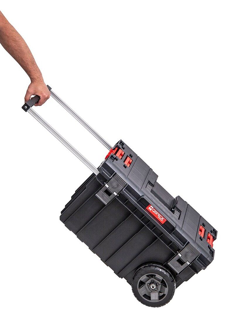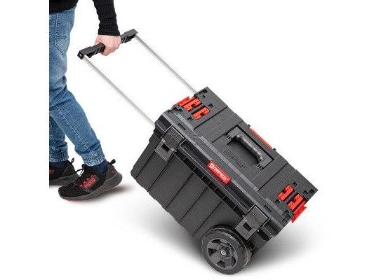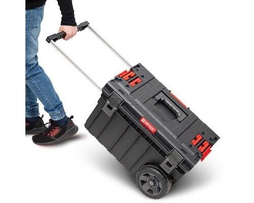 Mobile toolbox with double telescopic handle; comfortable tray, durable latches, solid handle, seal in lid, waterproof and dustproof construction, modular and reinforced construction, large wheels, metal axle, excellent manoeuvrability, polyamide connectors; Can be combined with QS ONE and PRO modules