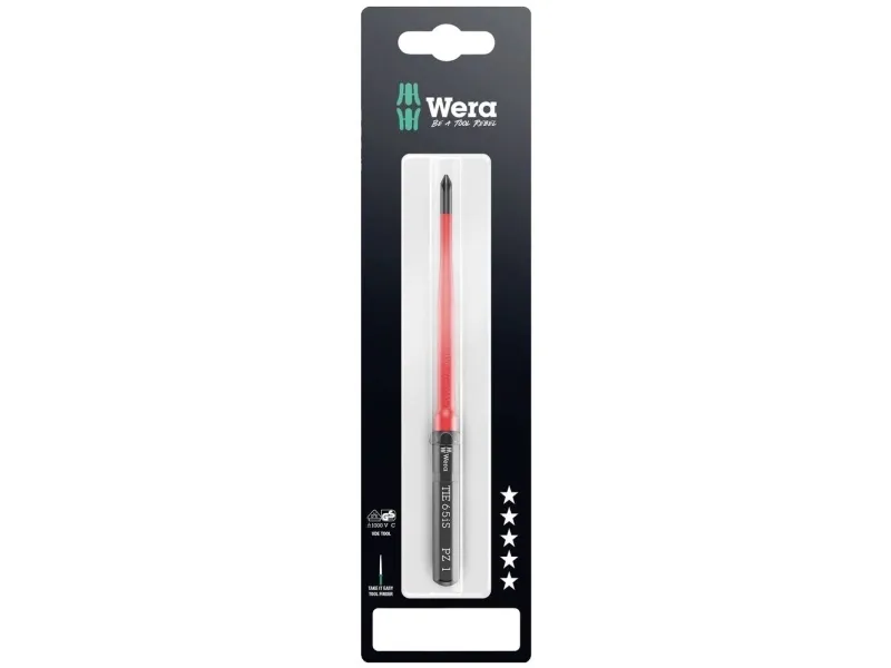 Udskiftningsklinge med reduceret klingediameter med integreret beskyttelsesisolering, på den måde kan man nå og bearbejde dybtliggende skrue- og fjederemner. Individuelt testet værktøj iht. IEC 60900. Stykkontrol ved 10.000 V for sikkert arbejde ved tilladte spænding på 1.000 V. Wera Wera Black Point-spidsen giver nøjagtighed og optimeret korrosionsbeskyttelse.