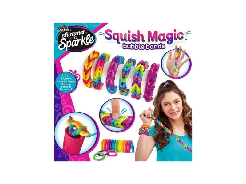 Create cool sensory rainbow bright bracelets with Shimmer n' Sparkle Squish Magic Bubble bands. Stack'em, squish'em! Its super sensory fun - simply loop & loom to create amazing super stretchy and squishy bracelets. Bubble bands are a bigger, stretchier take on traditional loom bands. Create super cool chunky loom bracelets for squishy fashion fun!