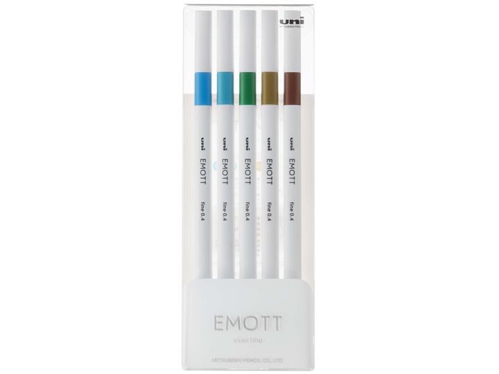 EMOTT fineliner penne tilbyder en række af 40 flotte farver og en minimalistisk æstetik. EMOTT er omhyggeligt designet til holdbarhed og glat skrift, med en slank hvid form og en holdbar spids, der ikke bøjer eller flækker, hvilket sikrer ensartet linjebredde i enhver vinkel eller tryk. Nyd en klar 0.4 mm linje med fremragende farvedækning og vandafvisende blæk, der ikke falmer. Ideel til bullet journaling, håndbogstaver og notetagning; farvekoordination og udtryk har aldrig været nemmere eller sjovere. Disse sæt har særligt udvalgte kurerede farvekombinationer i 5- og 10-delte sæt, der komplementerer og illustrerer årstider, stemninger og følelser. 5-pennesættene kommer med en stilfuldt bordstander, der både opbevarer og viser pennene. 10-pennesættene har et slankt flip-top etui, der kan vinkles til skrivebordsbrug og derefter vendes tilbage for nem opbevaring.