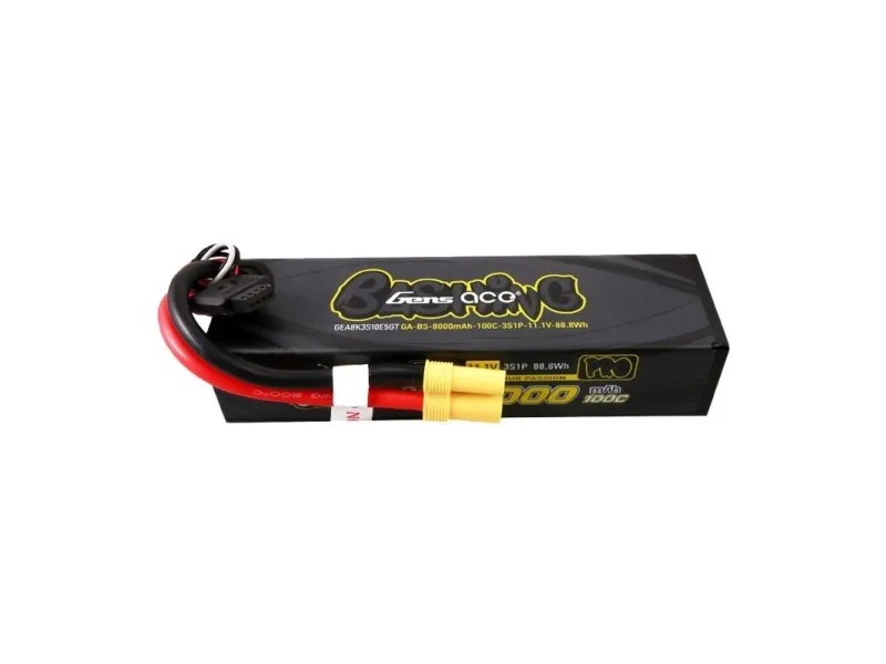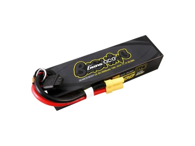 Featuring an EC5 connector, the Gens Ace G-Tech Bashing Series is a high-performance power source designed for heavy-duty RC vehicle use. It was specifically designed for ARRMA vehicles, offering a perfect fit. Its 8000mAh capacity and 11.1V voltage ensure long runtime and fast response to changing track or field conditions. The battery features a discharge rate of 100C, which means it is capable of delivering the energy needed for maximum speeds and powerful acceleration. Weighing 510g and measuring 158 x 47 x 34 mm, it is ideally suited for 1:7 scale models such as the FELONY 6S BLX, LIMITLESS, INFRACTION 6S BLX, as well as 1:8 and 1:10 scale models including the TYPHON 6S/3S and KRATON 6S BLX. The case is made of PC material and silicone for extra protection and durability.