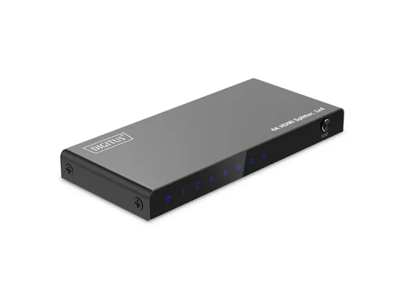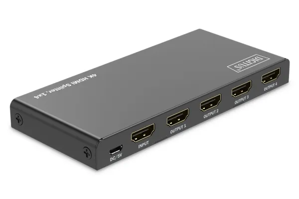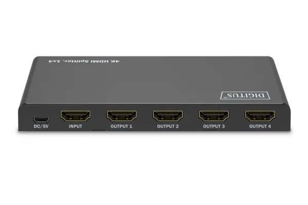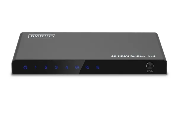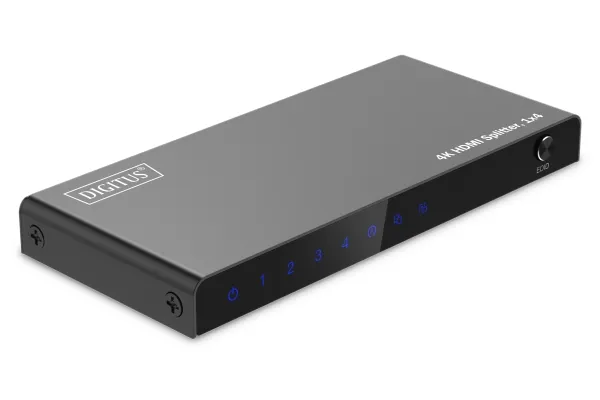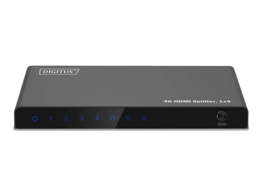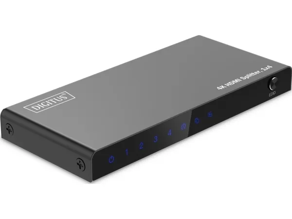 The DIGITUS HDMI video/audio splitter delivers performance with support for 4K resolution at 60 Hz. With four HDMI output ports, it allows distribution of audio and video signals to multiple displays, making it suitable for various applications in home entertainment or professional setups. This splitter features EDID Management and provides compatibility with modern home theater systems, ensuring video quality and audio support, including DTS and Dolby Digital. Its compact desktop form factor and metal housing make it practical and stylish for any environment.
