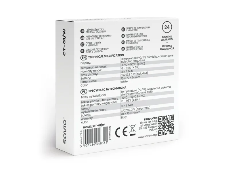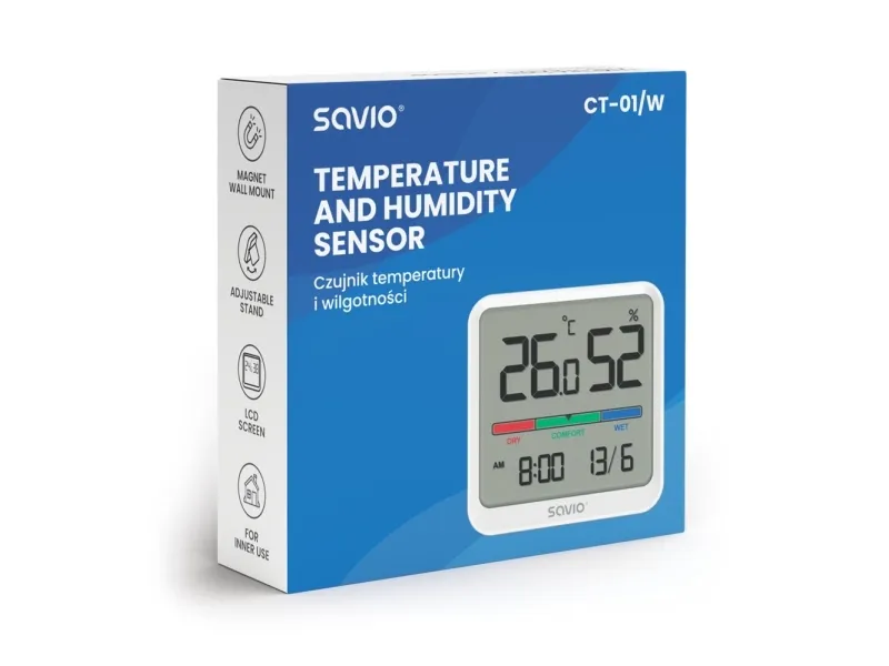Temperature and humidity sensor CT-01/W Temperature and humidity sensor CT-01/W sensor from Savio is a measuring device that allows you to track temperature and ambient humidity. This is useful, among other things, for storing food, taking care of plants, supervising manufacturing processes in warehouses, or for efficient energy management.