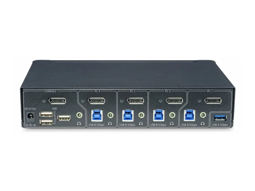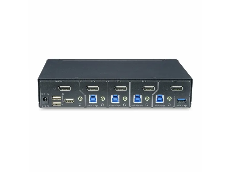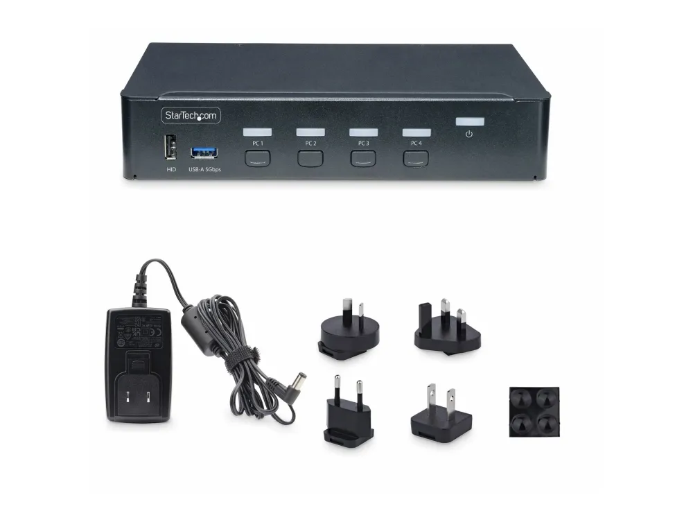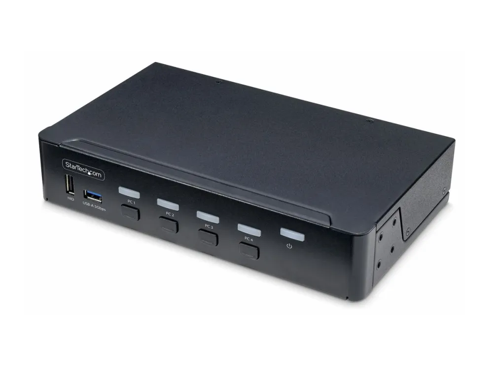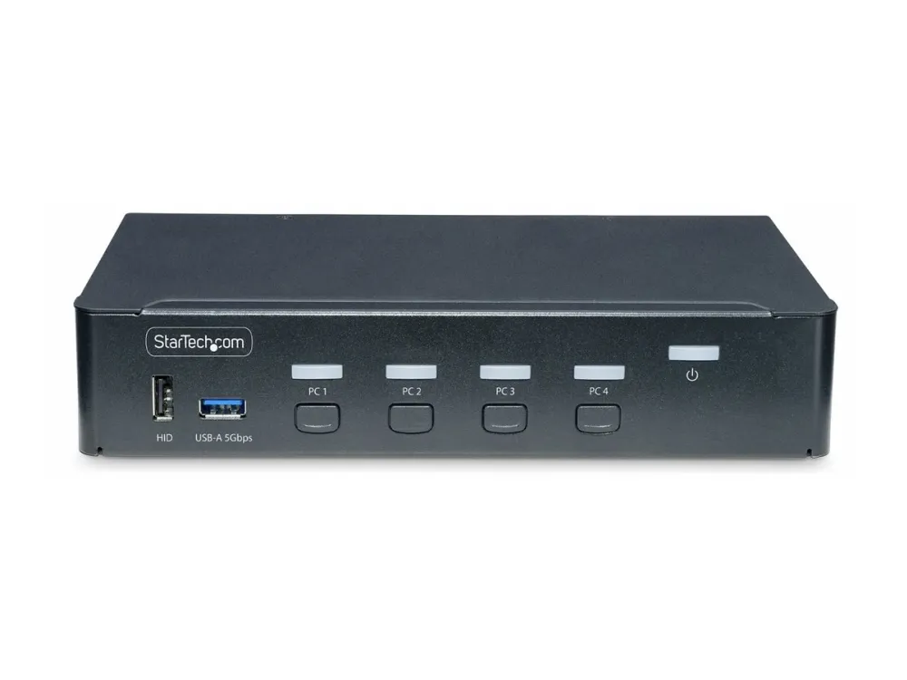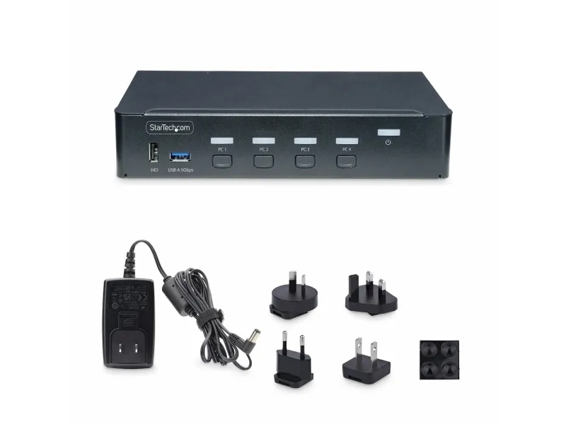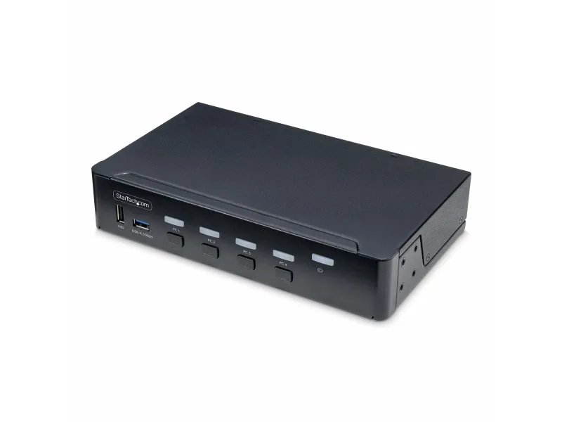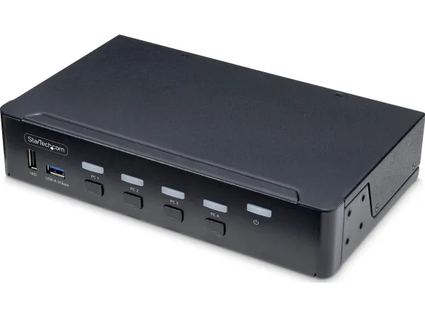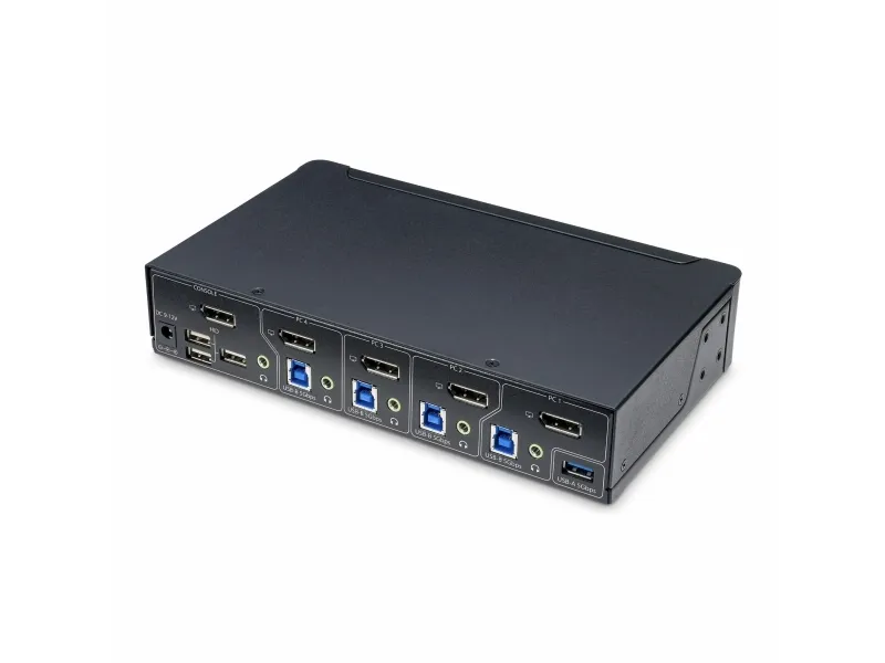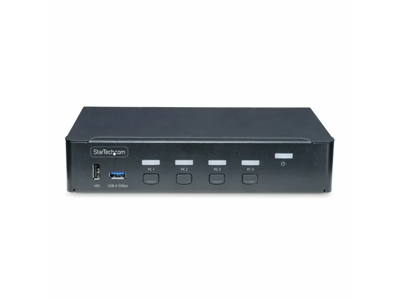 The StarTech.com 4-Port DisplayPort KVM Switch is a versatile solution designed to meet the needs of demanding computing environments. This TAA-compliant device supports 4K 60Hz resolution, ensuring stunning visual clarity for all your tasks. With USB 3.2 Gen 1 and USB 2.0 ports, it offers efficient connectivity for a wide range of peripherals. The switch features a rugged metal housing, equipped with both 6 kV and 8 kV ESD protectors, providing robust protection against electrostatic discharge. Users will appreciate the convenience of pushbutton and hotkey switching, allowing for effortless control over connected devices. Additionally, the KVM switch supports HDR10 and deep color, offering vibrant image quality and reliable performance. Whether for professional use in design, gaming, or video editing, this KVM switch stands out for its reliability, durability, and high-quality output.