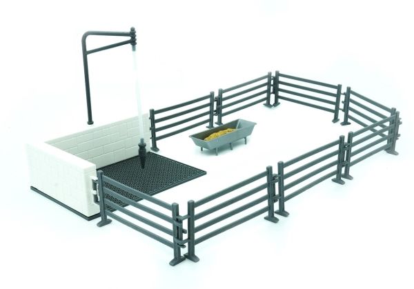 Der medfølger 8 sektioner hegn, 1 heste bad og 1 fodertrug.