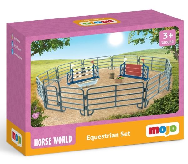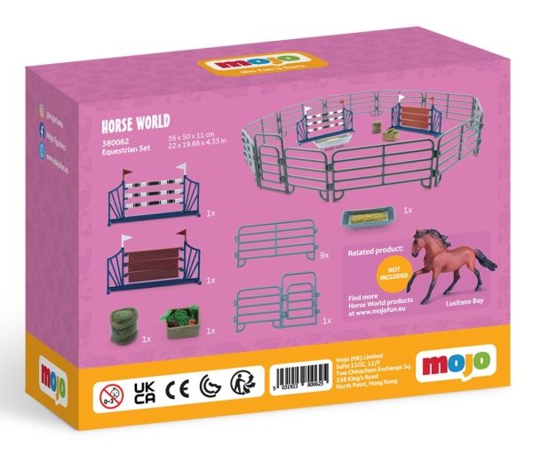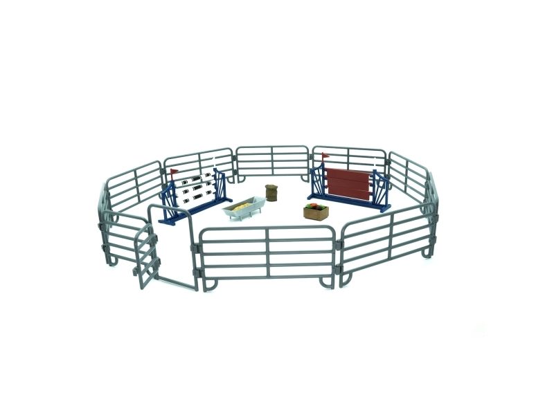 Der medfølger 9 sektioner hegn, en låge, 2 springbomme, 1 heste bad, 1 fodertrug, 1 spand havre og 1 kasse med lækkerier til hesten.