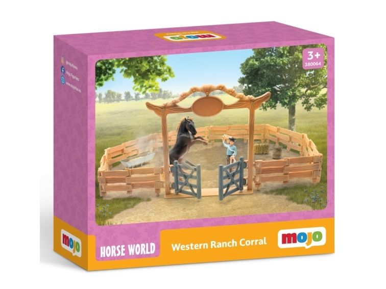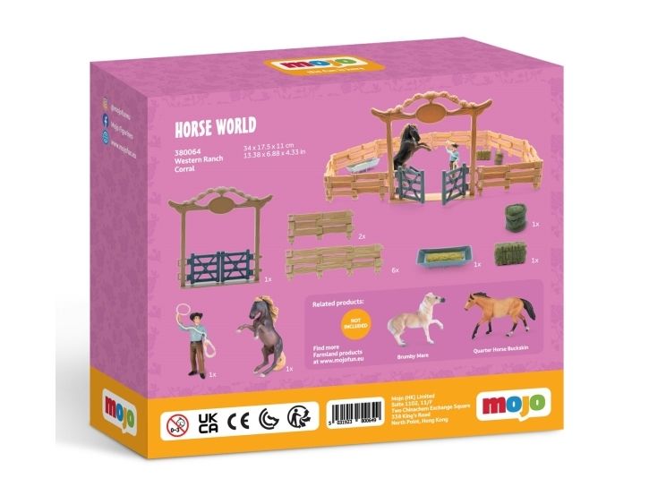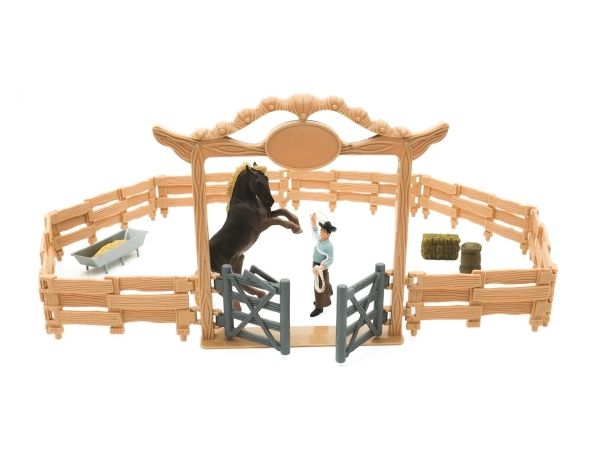 Der medfølger 1 cowboy med lasso, 1 hest, 1 indgang med låger, 8 hegn, 1 fodertrug, 1 halmballe og 1 spand havre.
