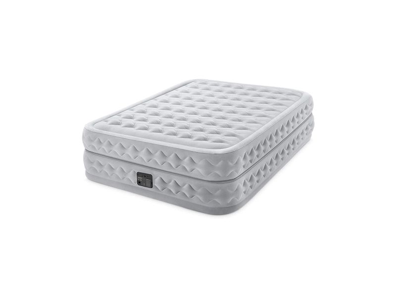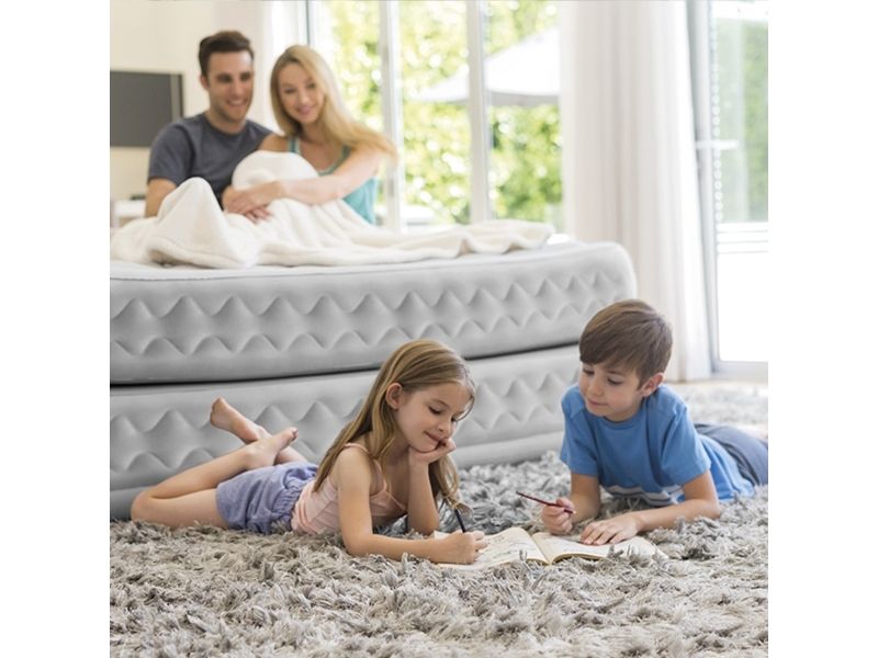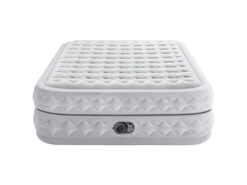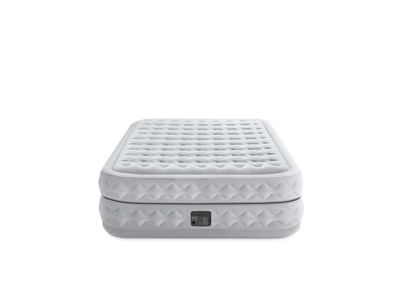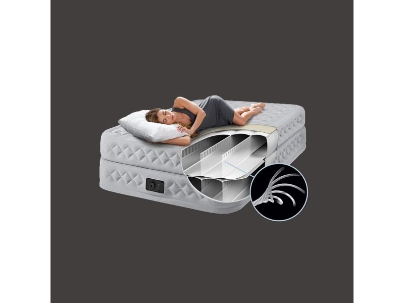 Senge DuraBeam Supreme Queen med 220 V-pumpe Den 152 x 203 x 51 cm store flyseng Supreme Air-Flow Airbed Queen med integreret elektropumpe fra Dura-Beam® Deluxe-serien fra Intex indbyder til afslapning og søvn i højeste kvalitet. Fremstillet af et netværk af sammenkoblede luftkamre under den øverste del af overfladen og på siderne af luftbalden kan luften flyde frit og jævnt rundt og sørger for størst mulig styrke og stabilitet. Derudover forbedrer den innovative, patenterede Fiber-Tech™-teknologi den indvendige standardkonstruktion ved hjælp af lette og meget faste fibre, hvilket giver en fremragende modstandsdygtighed og en enorm brugervenlighed. Luftlejet har en dobbelt konstruktion, det vil sige, at det egentlig består af to luftsenge, der befinder sig over hinanden. Den særlige konstruktion sørger for større stabilitet og komfort, og det bliver nemmere at få beteng fra luftsengen med en Spændebeng. Den omsluttende fals garanterer en sikker fastholdelse af almindelige opspændingselementer. Sengen har et blødt og konturerende 2-lags-komfort-top, som giver enestående komfort, suppleret med en forhøjet Sengehøjde på 51 cm, som gør det nemt at få den ultimative søvnoplevelse i sengen. Den indbyggede elektriske pumpe (220 - 240 V) gør det hurtigt og nemt at pumpe op. Der kræves ingen separat pumpe. Airbed er pumpet op inden for 4 minutter. Takket være den praktiske bæretaske kan sengen nemt transporteres og opbevares. Maks. Vægtbelastning: 272 kg.