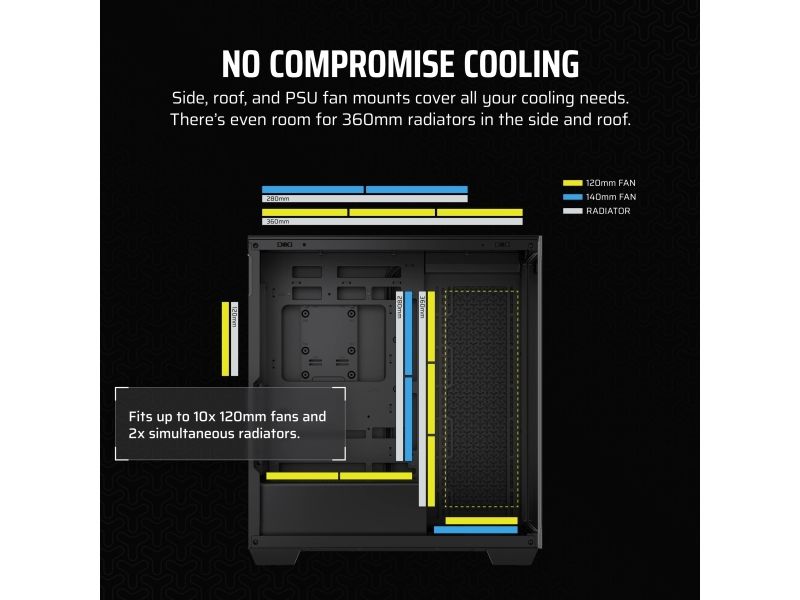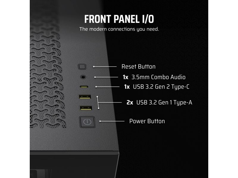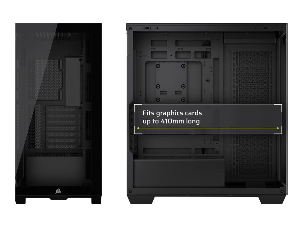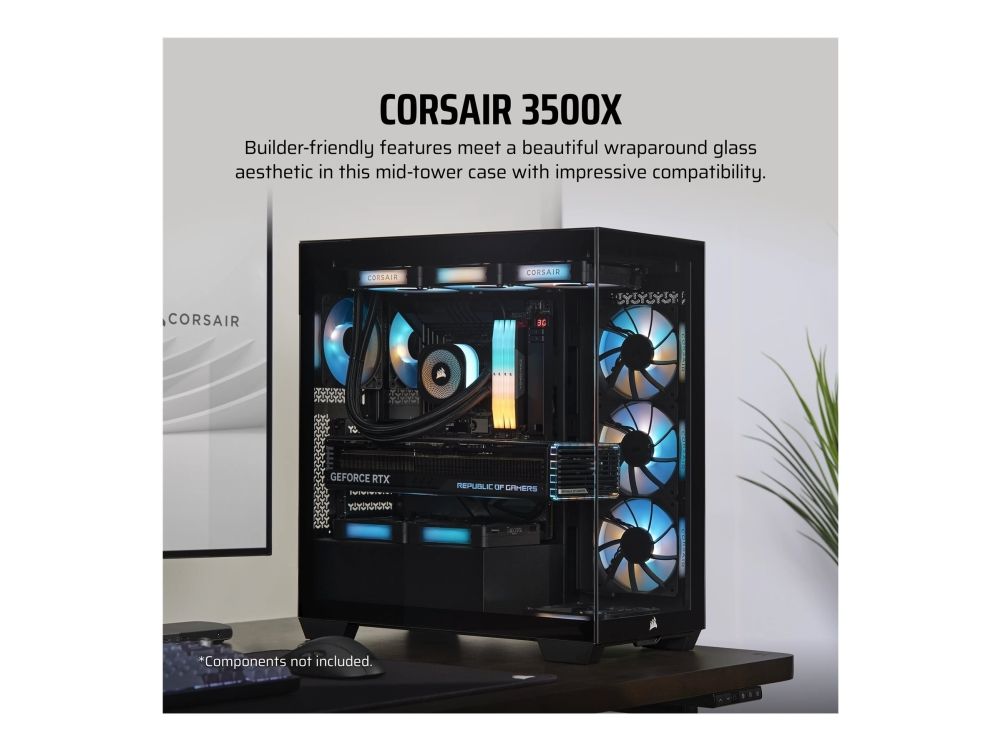 The CORSAIR 3500X mid-tower chassis stands out with its versatile cooling options and expansive compatibility, catering to both enthusiasts and professionals. It supports a wide array of motherboard sizes, from Mini-ITX to Extended ATX, and offers multiple cooling configurations, including space for up to 3 x 120 mm fans or a 360 mm radiator, ensuring your components stay cool under load. The chassis also features modern connectivity options with USB-C 3.2 Gen 2 and USB 3.2 Gen 1 ports, alongside a headphone/microphone jack, providing easy access to high-speed data transfers and audio connectivity. The elegant design, highlighted by a tempered-glass side panel and a glass front panel, showcases your build with sophistication. Additionally, integrated dust filters in the bottom, top, and side panels keep the interior clean, maintaining both aesthetics and cooling efficiency. With support for video cards up to 410 mm in length and CPU coolers up to 170 mm in height, the 3500X offers ample space for high-end components, making it a prime choice for building a powerful, visually stunning PC.