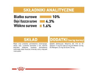 ANALYTISKE BESTANDDELE: Protein: 10,0 % - Træstof: 1,3 % - Fedtindhold: 4,3 % - Råaske: 1,5 % - Vand: 78,0 % - Omsættelig energi: 939 kcal/kg.