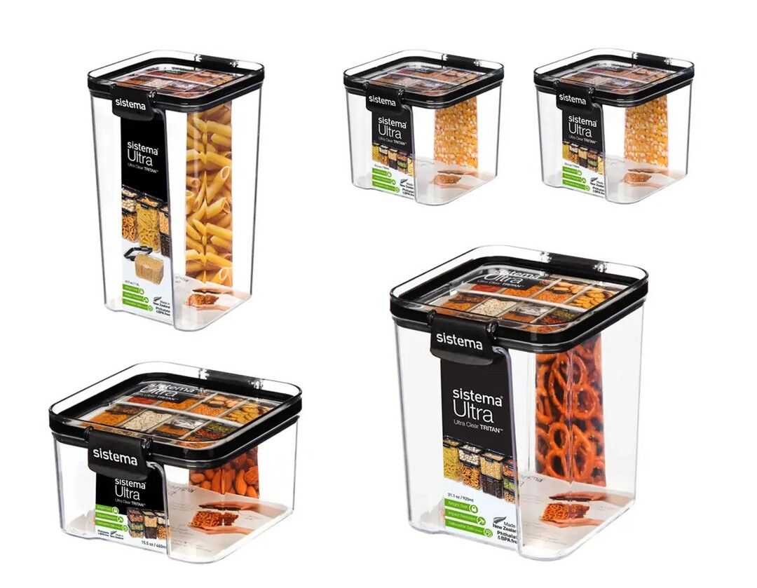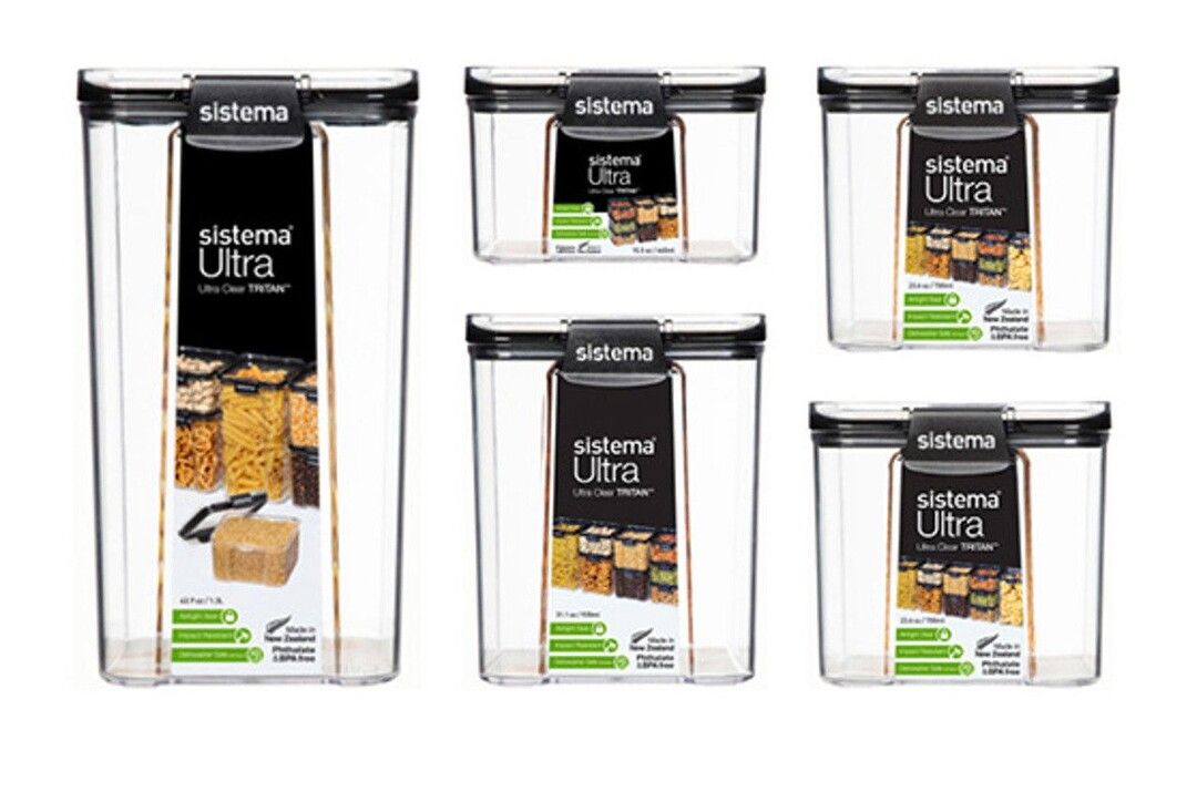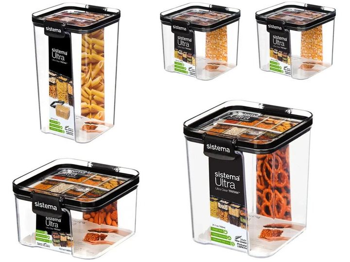 Ultra er en serie af krystalklare, glaslignende opbevaringsbeholdere i en meget slidstærk og brudsikker form, som er både stabelbar, pladsbesparende og effektiv for din køkkenorganisation. Med Sistemas nemme, tætsluttende låseclips og lufttætte forsegling, der holder indholdet frisk i længere tid. Ultra serien med det elegante design passer perfekt til at stå fremme i køkkenet, men er også særdeles velegnet til både skuffer og skabe. Opbevar nemt pasta, havregryn, mel, sukker, nødder og meget andet nemt og elegant. Boksene er nemlig udført i et flot design med et sort og klart låg, som gør det nemt at se, hvad boksene indeholder. Tåler opvaskemaskine (i øverste kurv). Phthalat-fri og BPA-fri.