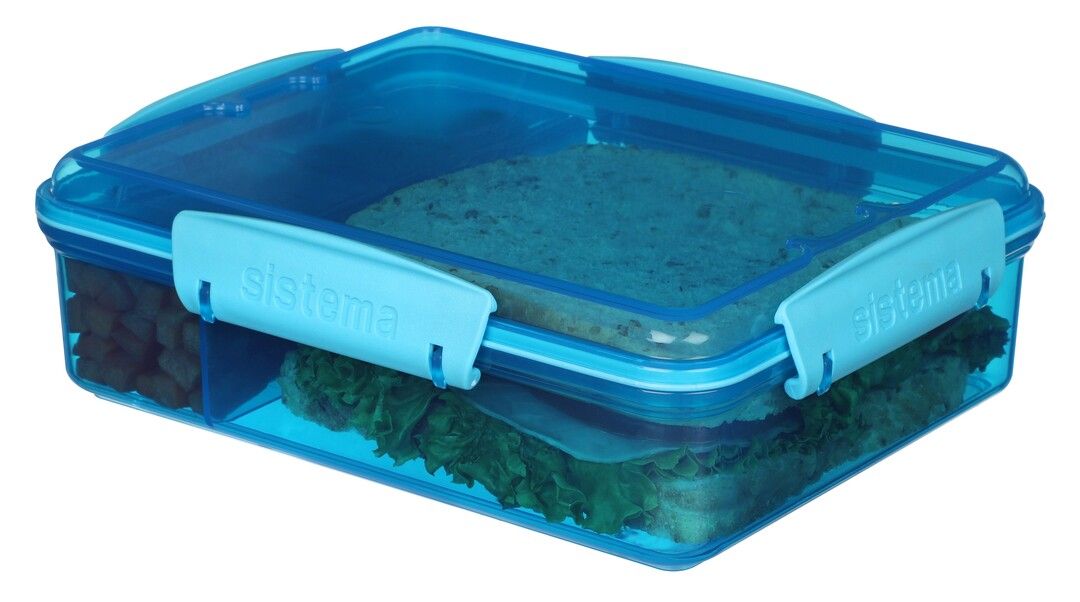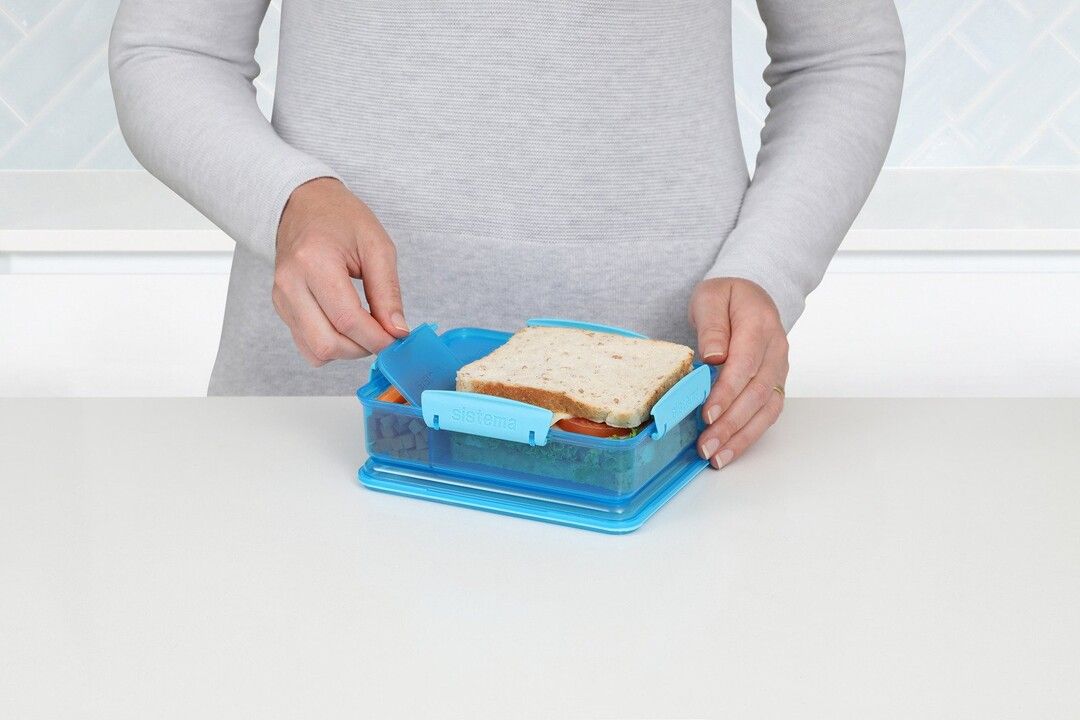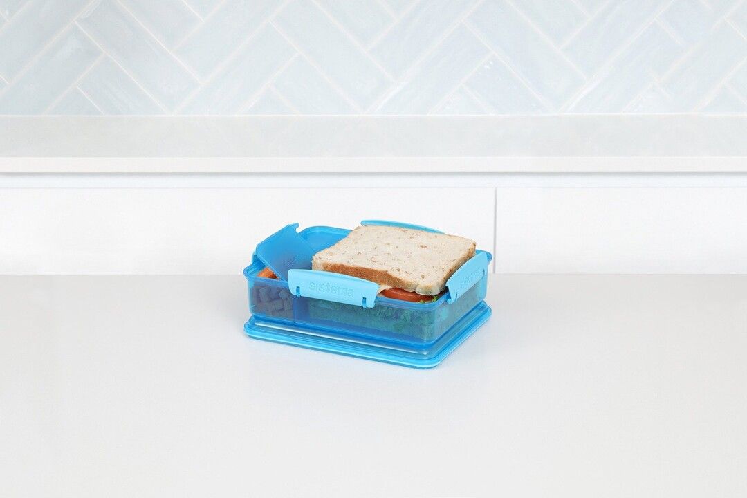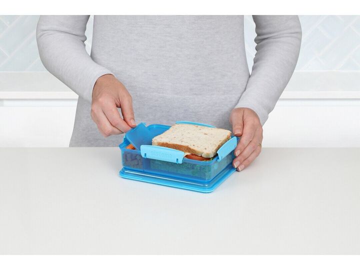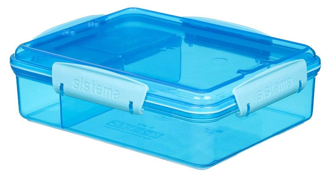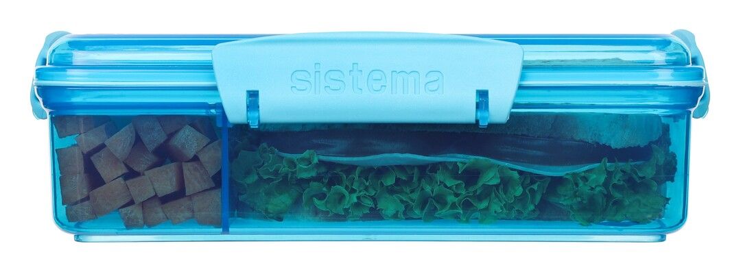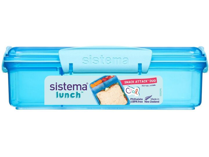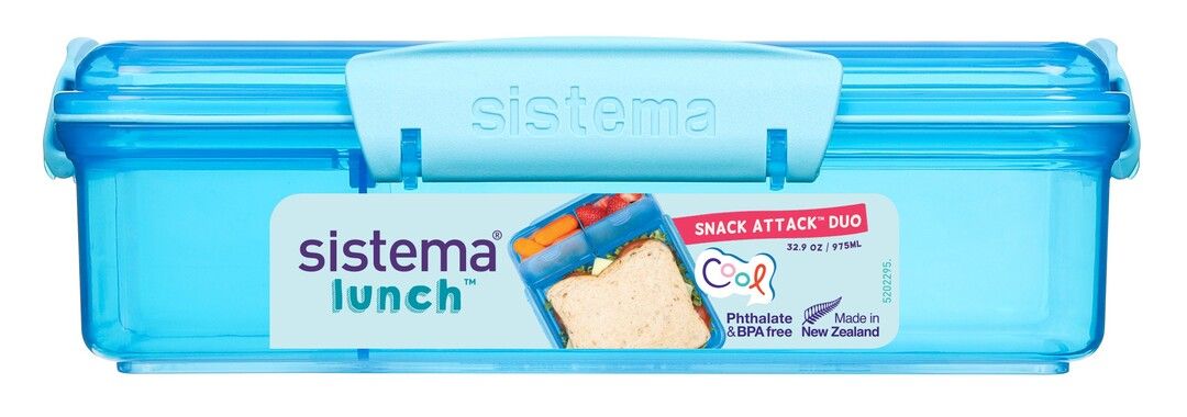 Snack Attack Duo fra sistema er blandt favoritterne til de mindste skolebørn, da den passer perfekt i det forreste rum på skoletasken. Madkassen indeholder et stort rum til rugbrød eller sandwich, samt to mindre rum med særskilte låg, som egner sig perfekt til eks. rosiner, grøntsager, nødder eller frugt. Lågene kan afmonteres, så madkassen får 3 åbne rum. Fås i de tre flotte farver: Teal, Blue og Pink. Tåler opvaskemaskine (øverste hylde), fryser og opvarmning i mikroovn (uden låg). 100% fri for BPA og Phthalater.
