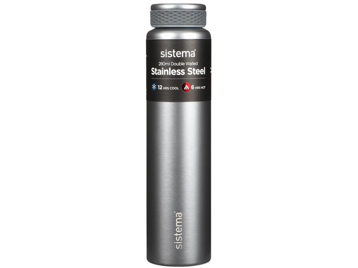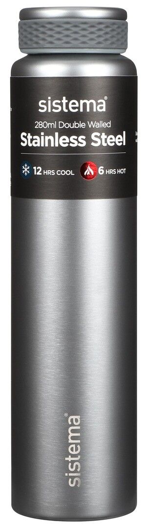 Stainless Steel 280ml fra sistema er en lille, fiks og elegant termoflaske, som passer perfekt til de mindste skolebørn eller en hurtig kop te/kaffe til cykelturen. Den rustfri stålflaske er fremstillet i dobbelt isolering for at indkapsle temperaturen længere, samt af højkvalitets rustfrit stål, der ikke ruster over tid. 100% lækagesikkert isoleret låg sikrer, at du kan have den med i tasken uden bekymringer. Fås i de flotte farver: Blue, Teal, Lavender, Green, Light grey og Dark grey. Termoflasken holder væsken kølig i op til 12 timer og varm i op til 6 timer. Tåler ikke opvaskemaskine, mikroovn, fryser og væske med kuldioxid.