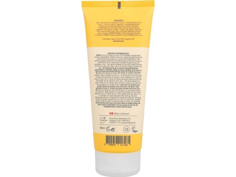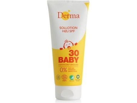 Derma Eco Baby Sollotion er en økologisk, parfumefri solcreme særlig velegnet til babyer og børns sarte hud. Med fysisk nanofri filter, der lægger sig som en hvid hinde på huden og reflekterer solens stråler. Solcremen er meget vandfast og med høj faktor, der beskytter effektivt mod solens UVA- og UVB-stråler.