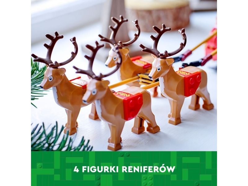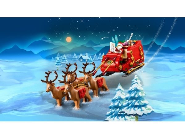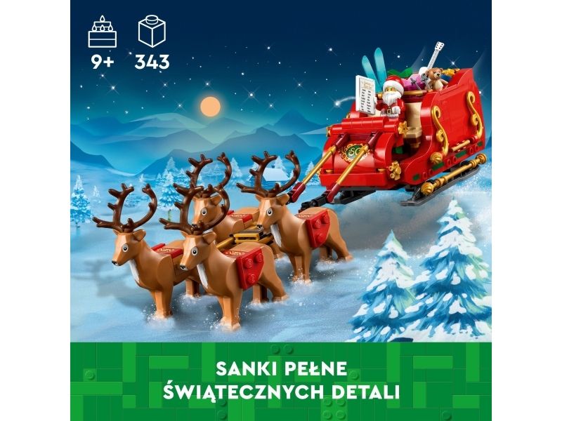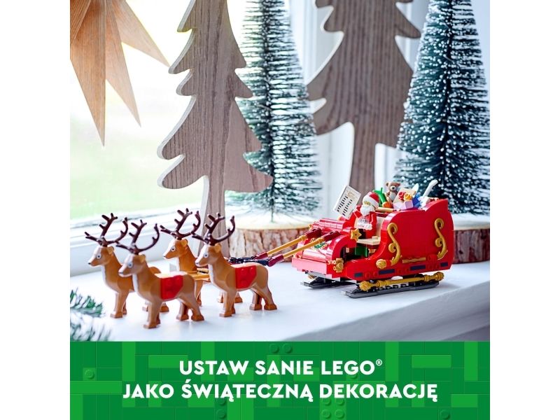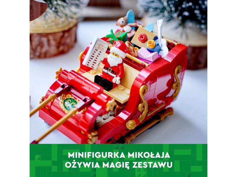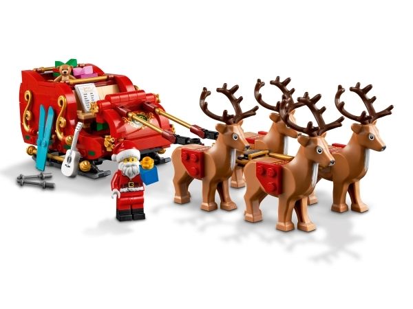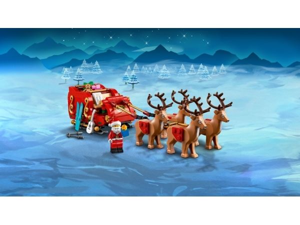 Smånisse-aspiranter kan bygge og ha det moro med den vakre røde og gullfargede sleden og utforske alle pakke-elementene inni, inkludert en kosebamse, gitar og et par ski. Minifiguren av julenissen vekker settet til live og kan plasseres foran i sleden med listen over snille og slemme barn i den ene hånden. Julelekesettet inkluderer også fire søte reinsdyrfigurer som får i gang late som-leken, hvor barn kan finne på spennende historier på Nordpolen. Når leken er over, kan sleden brukes som koselig julepynt som sprer julestemning i rommet.