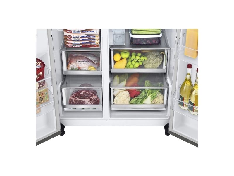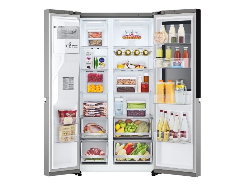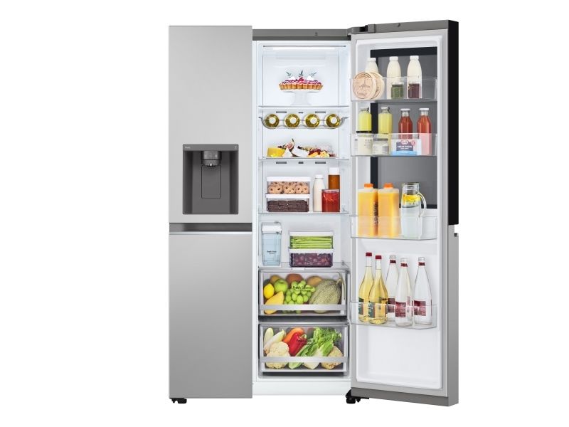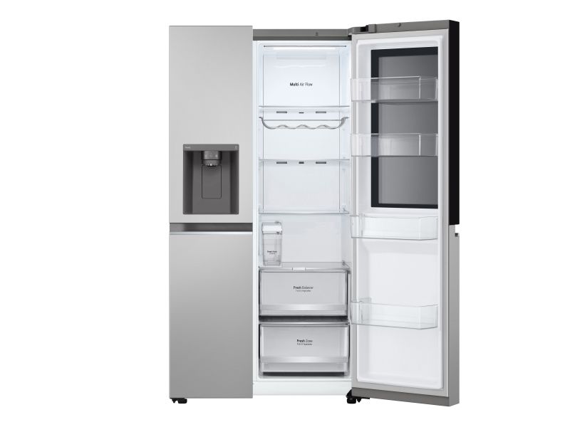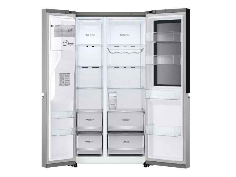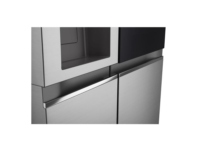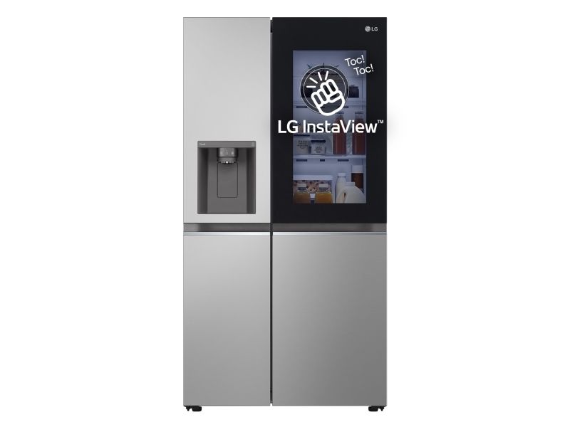 LG InstaView GSGV81PYLL. Appliance placement: Freestanding, Product design: American door, Product colour: Silver. Total net capacity: 635 L, Climate class: T, Noise emission class: C. Fridge net capacity: 416 L. Freezer net capacity: 219 L, Freezer position: Side-placed, Freezing capacity: 12 kg/24h. Energy efficiency class: E, Annual energy consumption: 350 kWh, Energy efficiency scale: A to G