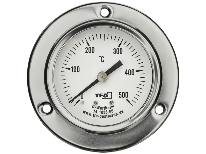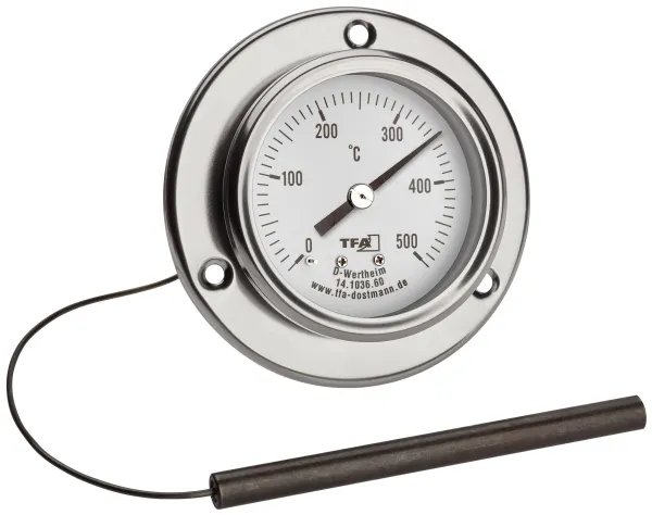 Det robuste termometer af rustfrit stål installeres fast og egner sig til efterfølgende udstyr i pizzaovnen, til den selvbyggede sten- eller træovn samt som reservedel. Termometeret har en fastgørelseskant og sættes ind i et forboret hul (dia. 60 mm) og fikseres med tre skruehuller udvendigt på ovnen eller grillen. På den måde kan du til enhver tid holde øje med den temperaturskala, der er beskyttet af en glasafdækning. Den 150 cm lange, fleksible metalsonde med følerelementet føres ind i tilberedningsrummet. Det analoge apparat måler temperaturer fra 0 til +500°C og er især egnet til anvendelse i træ-, sten- eller brødovn samt i pizzaovn, grill eller smoker.
