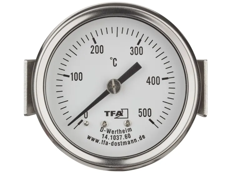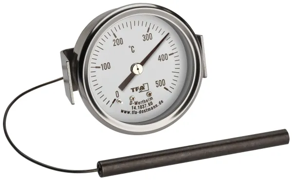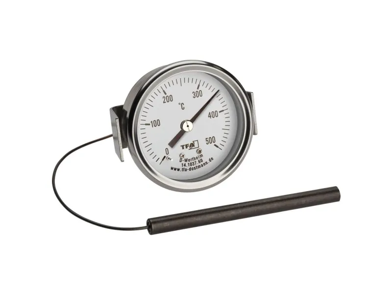 Det robuste termometer af rustfrit stål installeres fast og egner sig til efterfølgende udstyr i pizza- eller ovn, til den selvbyggede stenovn samt som reservedel. Termometeret sættes udvendigt på ovnen eller grillen i et forboret hul (dia. 60 mm) og fastgøres med et klemmeelement. På den måde kan du til enhver tid holde øje med den temperaturskala, der er beskyttet af en glasafdækning. Den 150 cm lange, fleksible metalsonde føres ind i tilberedningsrummet med følerelementet. Skruemøtrikkerne til fiksering er lige ved hånden. Det analoge apparat måler temperaturer fra 0 til + 500°C og er især egnet til anvendelse i træ-, sten- eller brødovn samt i pizzaovn, grill eller smoker.