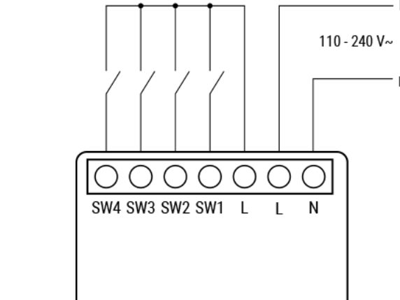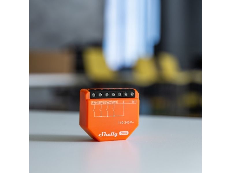 Wi-Fi-operated 4-digital input controller. With the ability to manage 4 digital inputs, Shelly i4 Gen3 enables you to manually activate or deactivate any created scene, synchronize actions, or execute complex trigger scenarios. Activate different devices and control the lights, shut the blinds, and activate scenes instantly from one location. Compact enough to fit behind most wall switches, Shelly i4 Gen3 is retrofit and takes less than 10 minutes to install under any regular 4-button switch. Multi-click - Up to 16 possible actions. New processor - ESP-Shelly-C38F chip with an increased memory of 8 MB. Improved durability of terminals. Supports scripting, webhooks, MQTT, WebSocket, HTTPS, UDP, TLS and custom certificates. No HUB required! Easy control through Shelly Smart Control app, various home automation protocols, and platforms. Shelly Plus i4 is an input reader device (it does not contain relay)