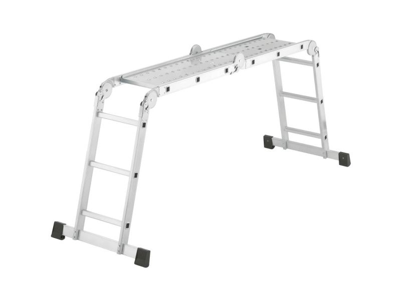 Hailo ProfiStep combi aluminium universalstige 4-dele Arbejdsplatform, lægnings- og ståstige i et · 6 sikringsled til at låse eller låse lederdelene · med separat 2-delt, skridsikker riflet metalplatform (143 x 30 cm) for nem og sikker anvendelse som arbejdsplatform · skridsikker, riflede skud · 2 stabile tværbjælker med stabile PVC-fødder (tværbjælke-længde 73 cm) · bredde afrundede holme · ekstremt fast holder-sprosforbindelse · kompakt sammenfoldelig til transport eller opbevaring (B x D x H) 99 x 37 x 27 cm · belastbar op til 150 kg. Den variable og alsidigt anvendelige 4-delte aluminium-universalstige med 6 sikkerhedsgeler og metalplatform.