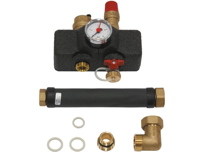 Vaillant kedel-sikkerhedsgruppe 307591 Kedelsikkerhedsgruppe til alle Vaillant varmeproducenter op til 50 kW. Komplet formonteret med sikkerhedsventil 3 bar RP 1/2, manometer, isoleringsventilator inkl. tilslutningsrør og isoleringsskål.