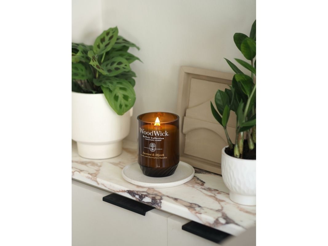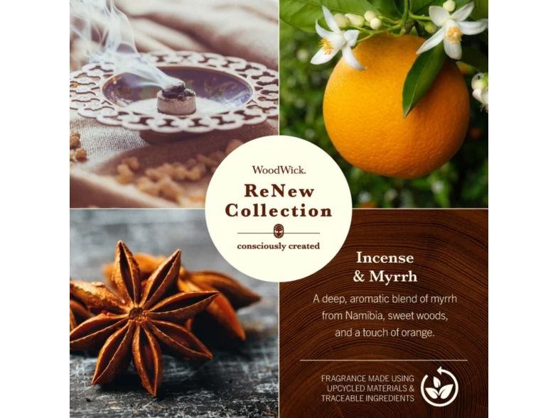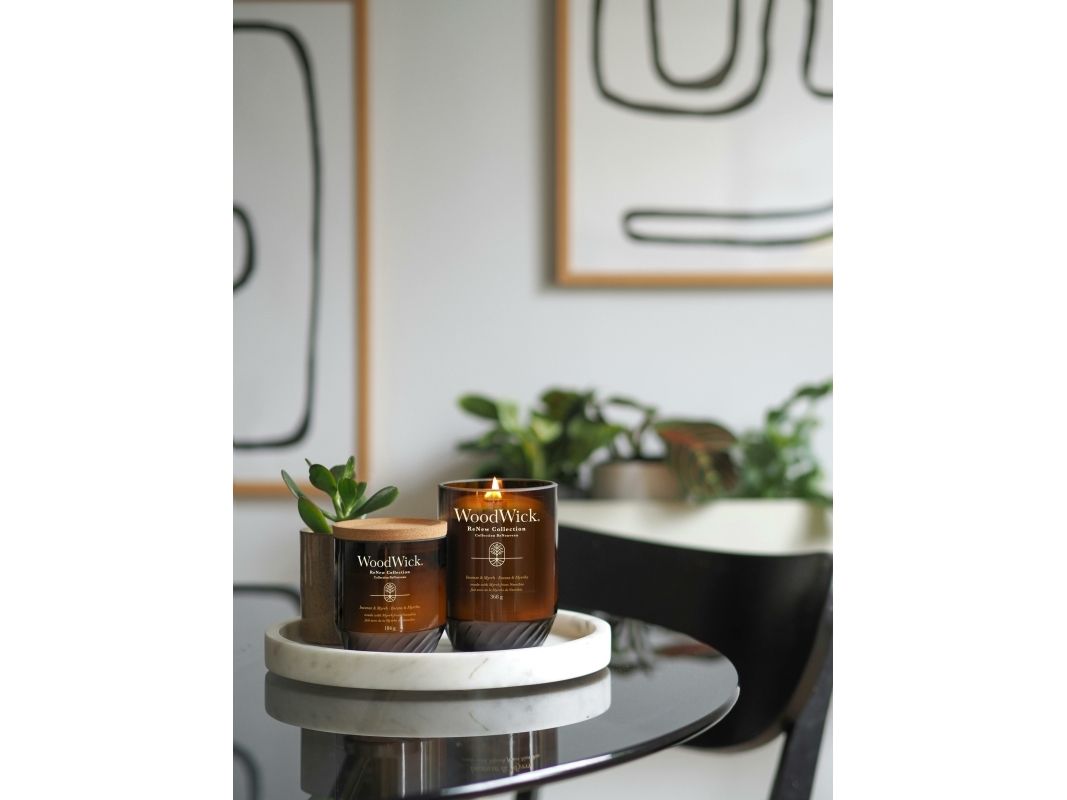 WoodWick® ReNew serien er skabt med omtanke for at hjælpe dig med at træffe et bevidst valg. Duftserien består af 6 udvalgte dufte i to forskellige størrelse glas. Hver duft indeholder biobaserede ingredienser, herunder upcyclede materialer og æteriske olier. Den plantebaserede voksblanding er uden farvestoffer, og emballagen er sammensat af genanvendelige materialer. WoodWick® ReNew er et velovervejet valg til dine specifikke behov.