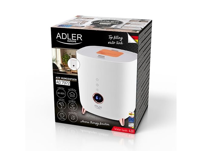 In addition, the Adler 7972 humidifier is equipped with a hygrometer function that precisely sets the target humidity in the range of 40% to 90%. An advanced water shortage sensor ensures safety of use by automatically turning off the device when water resources run out. Thanks to the timer, you can adjust the working time of the humidifier to your needs, choosing from the option of automatic shutdown after 1, 2, 4 or 6 hours. Three-step regulation of the intensity of humidification allows you to adjust the operation of the device to the size and conditions of the room. The water tank with an impressive 4.0 liters capacity and the long working time on one filling of over 13 hours guarantee long-lasting and effective humidification.Adler AD 7972. Product colour: White, Control panel colour: Black, Display type: LED. Power: 23 W, Power supply type: AC, AC input voltage: 220 - 240 V. Width: 260 mm, Depth: 220 mm, Height: 320 mm