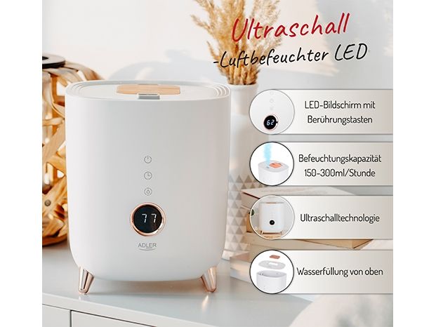 The Adler ultrasonic humidifier will surprise you with its advanced technology and functionality that will allow you to create ideal conditions for air humidity in your interior. The device is equipped with an LED display with touch buttons, thanks to which it will provide convenient operation and precise control over humidification. Thanks to the unique design that allows you to fill the water tank from the top, using the humidifier has become even easier and more ergonomic. The device monitors and displays the current room humidity in real time, allowing you to keep track of the conditions.