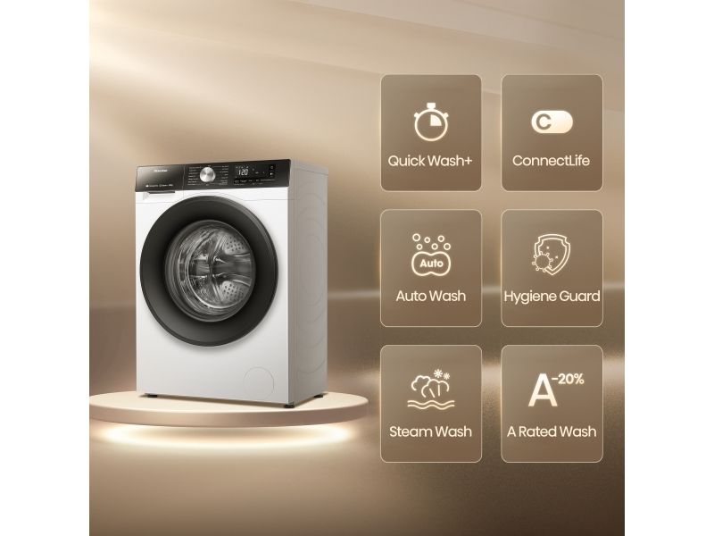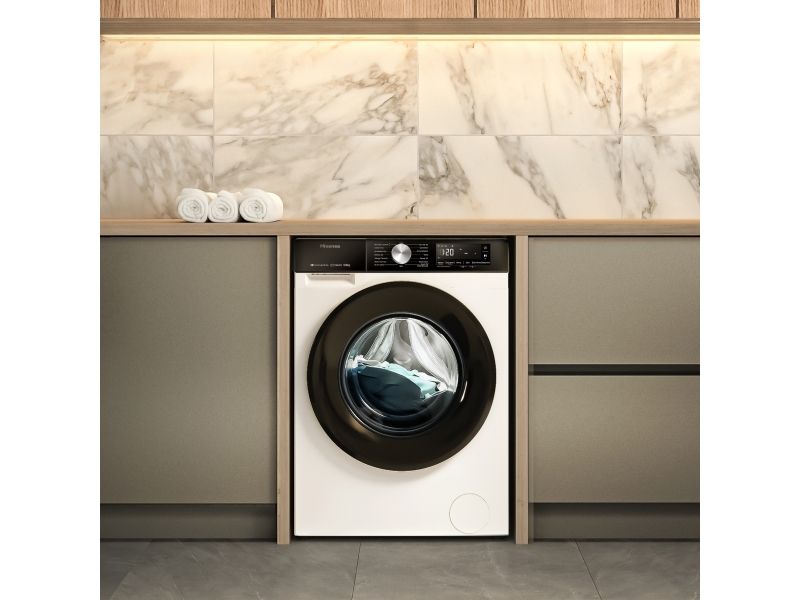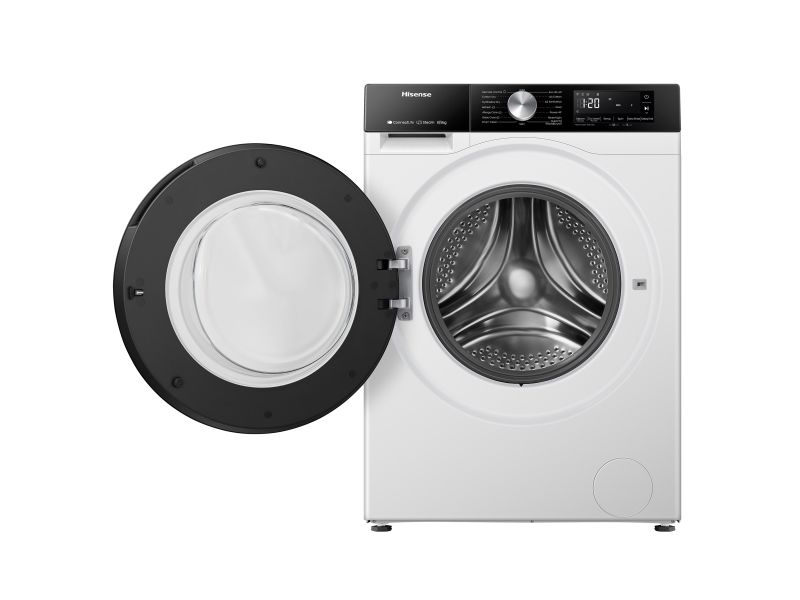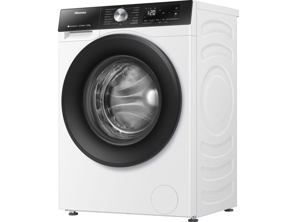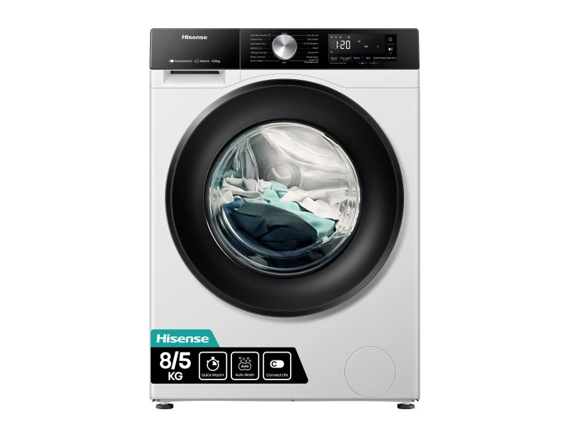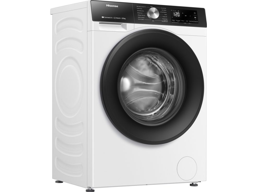 Discover the Hisense WD3S8043BW3 washer/dryer that combines washing and drying into one compact unit. With a loading capacity of 8 kg for washing and a maximum drying capacity of 5 kg, this appliance efficiently handles your laundry needs. The Raindrop Drum and Jet Wash system ensure optimal washing performance while the diverse array of drying programs, including Steam Refresh and AllergyCare, cater to specific fabric needs and hygiene requirements. This washer/dryer features IoT compatibility, allowing users to control and monitor their appliance remotely through the Connect Life application via Wi-Fi. The energy-efficient design ensures minimal power consumption during both washing and drying cycles, meeting Energy Class A standards. Additional safety features, such as control lock and double glazed door, offer peace of mind while the sleek front panel control and time remaining indicator enhance usability.