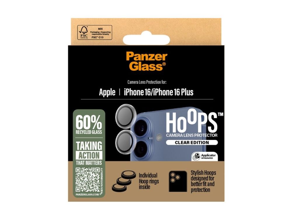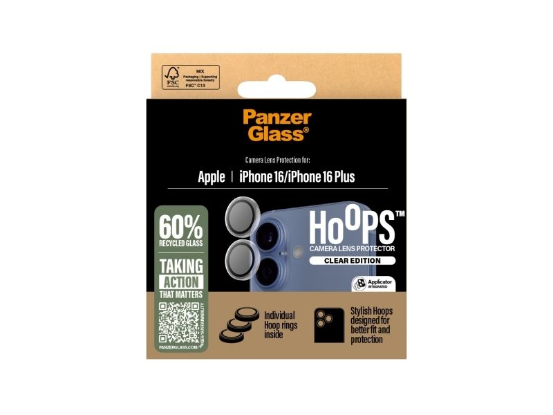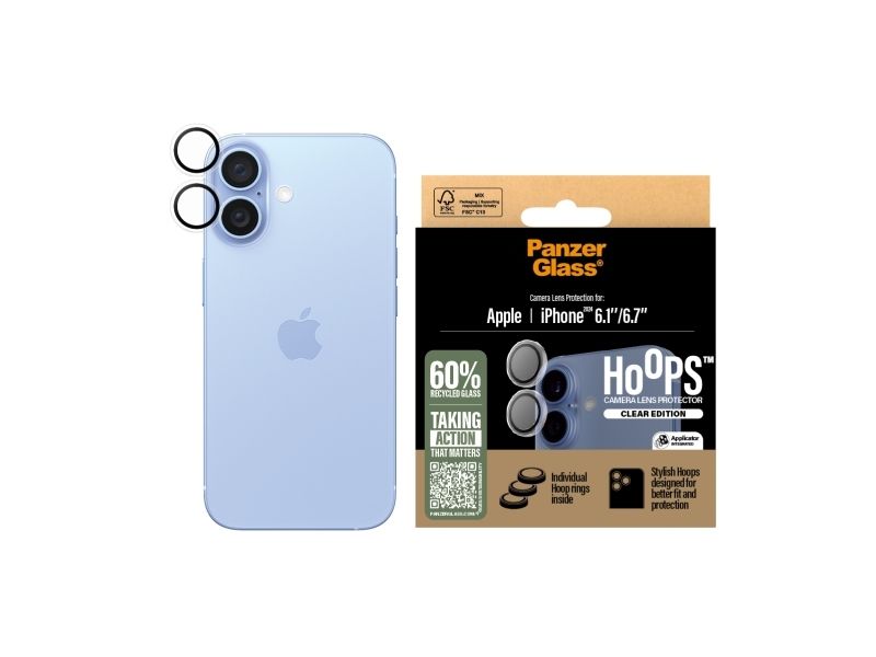 No "Oops!" with Hoops ! The PanzerGlass Hoops camera lens protector shields your camera lenses from scratch-creating bumps, drops on stone-hard floors, and the screeching kiss of keys in your pocket. The slim profile optic rings are equipped with scratch-and shock-resistant glass and a black aluminum frame that protect your lenses as well as looking great. And if you're worried about image distortion, rest easy: Hoops don't affect the clarity of your lenses or the quality of your photos – they just give you a bit more peace of mind. Hoops protect and prolong the lifetime of your phone so that one day you can pass it on to someone else who will love it just as much as you do. It's the new circle of phone life. By extending the lifespan of our devices, we postpone the need to produce new devices. This is one way of working toward a more sustainable future. Another is to use less packaging: In 2024, we reduced the amount of paper in our PanzerGlass core product packaging design by an average of 66 %*. So, of course, this product comes in a recyclable FSC-certified box. The optic rings are designed for easy application and perfect fit. They are equipped with a silicone adhesive along the edges and come with an easy-to-use applicator that makes installation a piece of cake (seriously!). And remember: Once installed, you'll never again fear your phone falling camera-first. This might not happen, but then again … it might!  *Reduction from 2022-2024 measured by comparing selected products from the PanzerGlass core range.