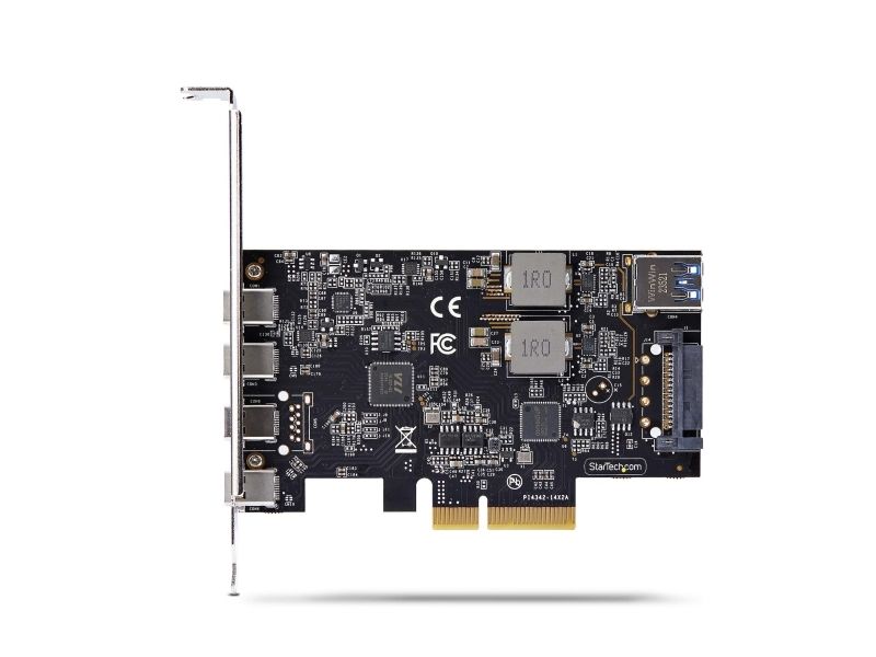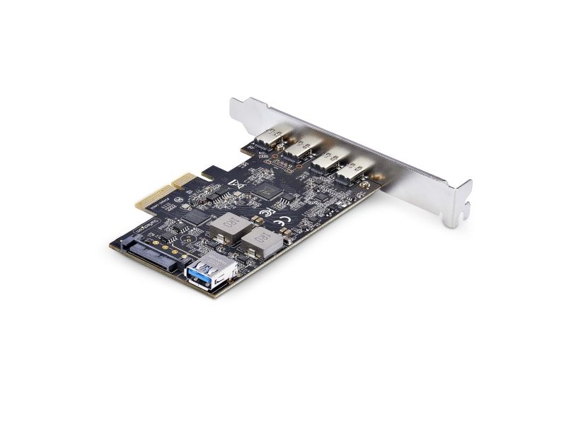 Upgrade your computer's connectivity with the StarTech.com 5-Port USB PCIe Card. This USB 3.2 10 Gbps PCI Express Card features four USB-C external ports and one USB-A internal port, offering a wide range of connection possibilities for various devices. With support for USB 3.2 Gen 2, it delivers data transfer rates of up to 10 Gbps, enabling quick and efficient file transfers. Compatible with Windows, macOS, and Linux, this versatile USB PCIe controller card ensures broad operating system support. It also includes a 15-pin Serial ATA power connector, providing reliable power to connected devices. The card's plug-in form factor and PCI Express 3.0 compatibility make it an easy and effective upgrade to enhance your system's connectivity.