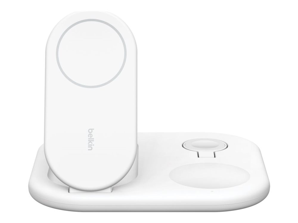 Belkin BoostCharge 3-in-1 - Trådløst ladestativ - magnetisk, sammenleggbar, med Qi2 + AC-strømadapter - 15 watt - Fast Charge - hvit