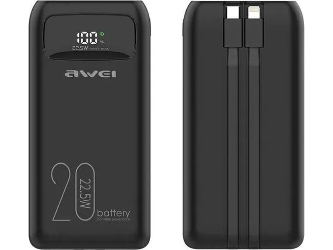 Powerbank Awei AWEI PowerBank P169K 20000mAh 22,5W svart/svart skjerm + PD/Lightning-kabler