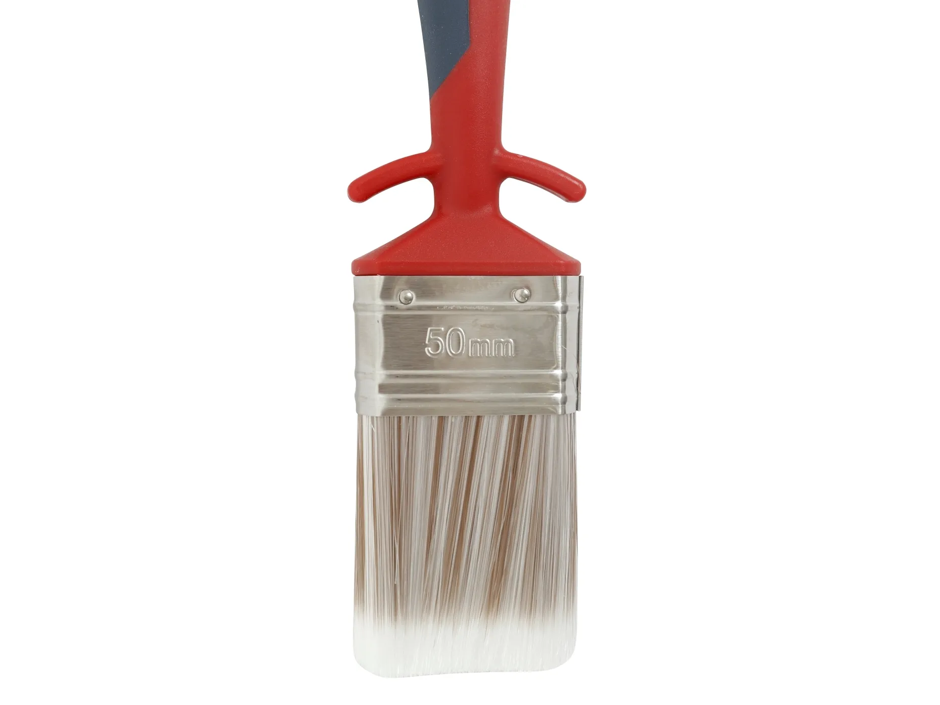 Størrelse: 50 x 20 mm Længde: 23,5 cm Materiale: PET/PBT og fibre = massiv/konisk hår 30% og hule hår 70% Greb: 2-komponet håndtag, som sikre et godt greb Egenskab: L-krog til at hænge penslen på malerspand Egenskab: Kan påmonteres forlængerskaft Farve: rød / blå