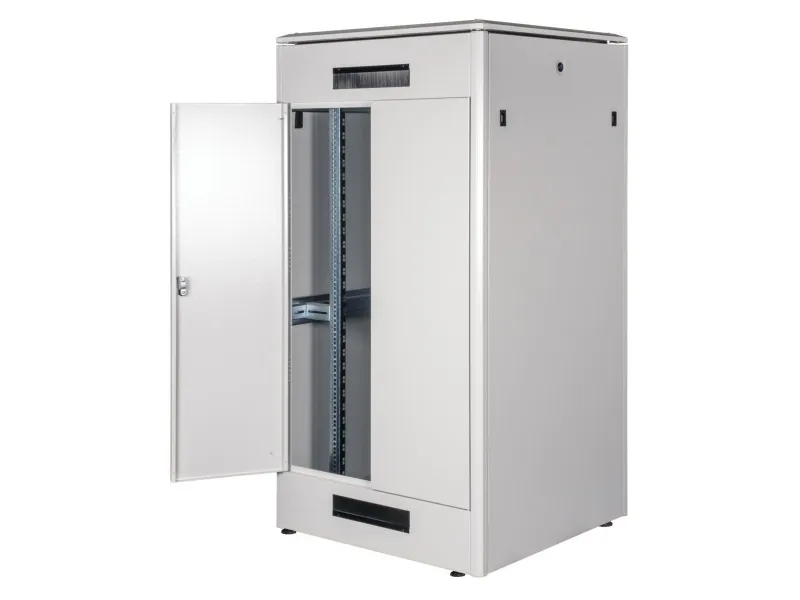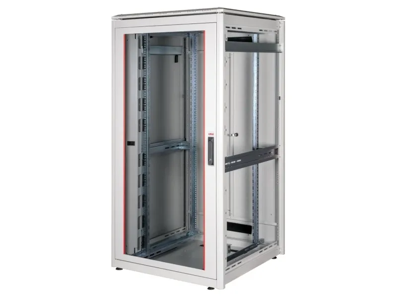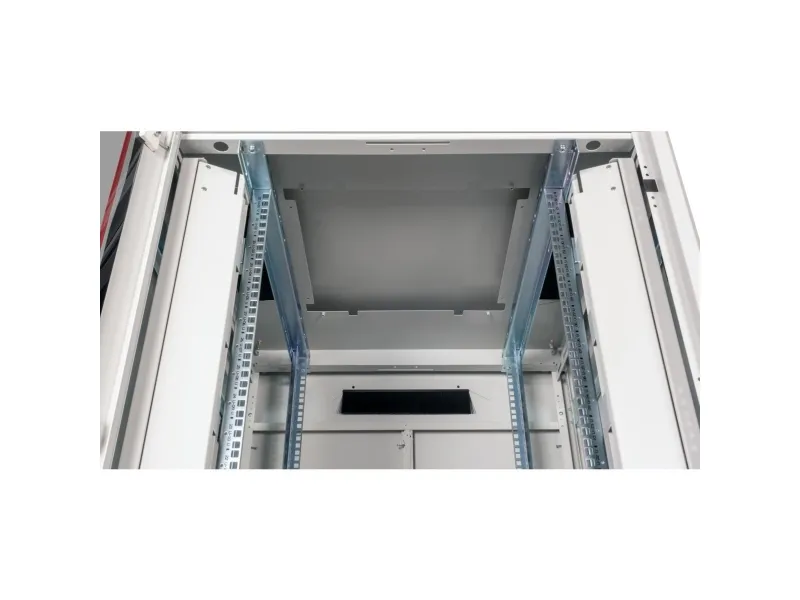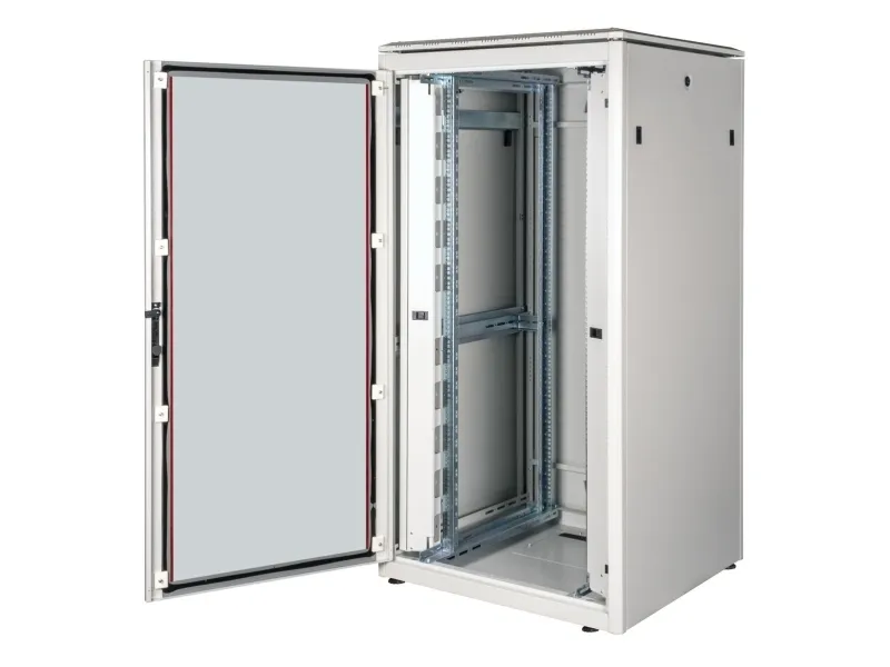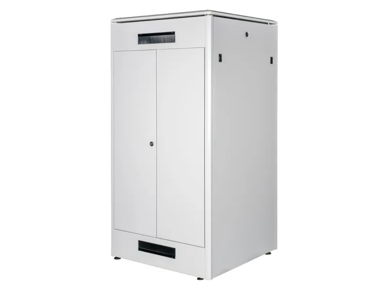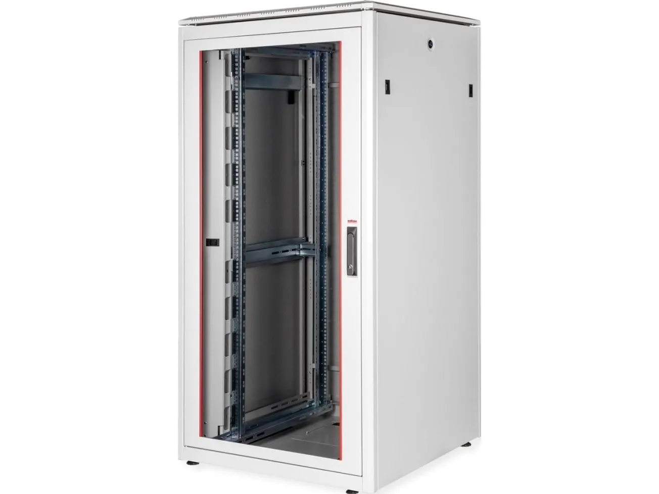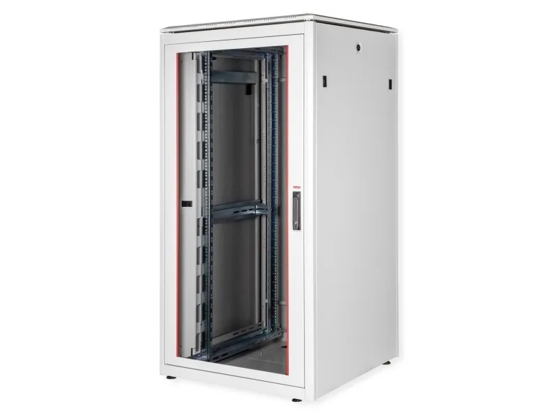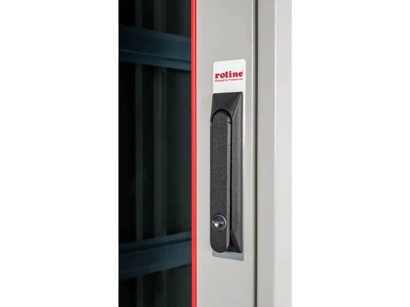 ROLINE 19-tommer netværksskab Pro 32 HE, 800x800 BxT glasdør grå Komfortable og fleksible netværkskabler, børstelejligheder til mange anvendelsesmuligheder, aftageligt låg forbedrer luftcirkulation, robust stålkonstruktion, aftagelige sidevægge og døre
