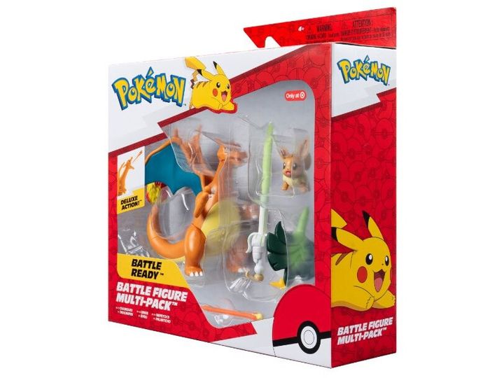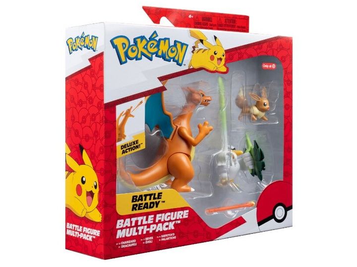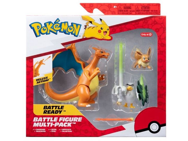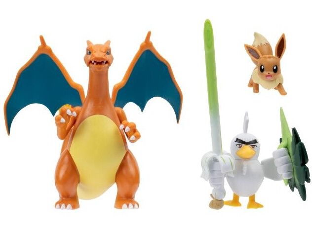 Unleash the powers of Normal, Fighting, and Fire with this Pokémon Battle Figure 3 Pack. Train with the Normal-type Eevee and dynamically pose the Fighting-type Sirfetch’d. When you’re ready for battle, send out the Fire-type Charizard and launch a fire blast missile. 2-inch Eevee fits in Clip 'N' Go Poké Ball and Carry Case Playset. These highly detailed figures look like they jumped out of the Pokémon Animated Series. Only available at Target Officially licensed Pokémon product from Jazwares.
