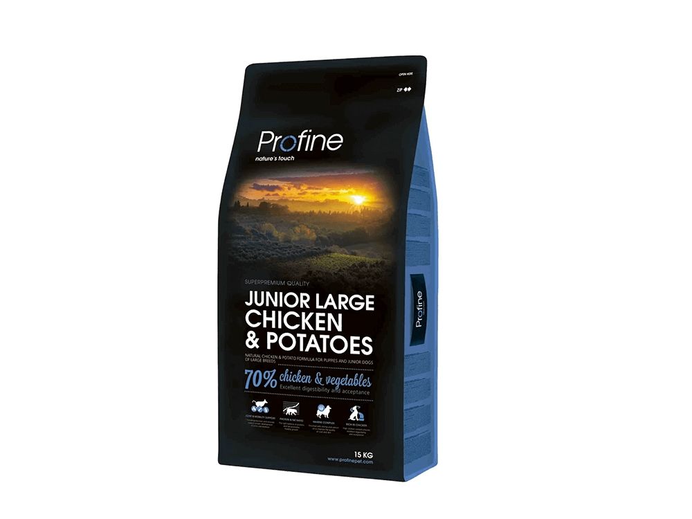 Profine Junior Large Chicken er med majs, kartofler, kylling, og kyllingelever. Dette er med til at give din hund de rigtige næringsstoffer.