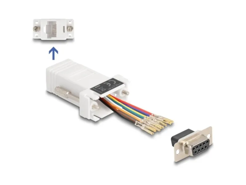 Med denne adapter fra Delock kan et serielt interface udvides med et valgfrit Cat Cat.5 / 5e / 6 kabler. Således kan pinbelægningen fastlægges individuelt. Hertil sættes kabelenderne ganske enkelt i det ønskede hul på stikket, så de går i hak i kabinettet.