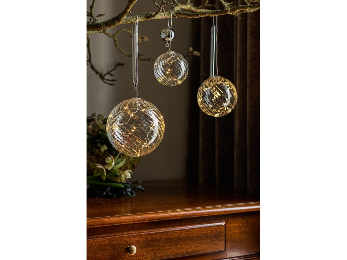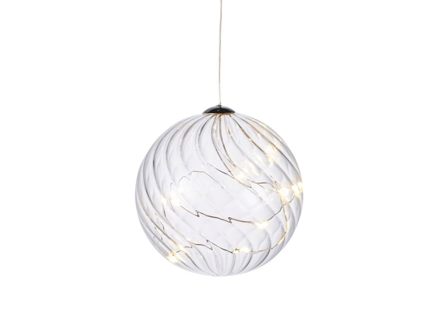 Vores Wave kugledekoration er lavet af mundblæst glas, og dens dekorative elementer er små stjerner og nyfalden sne. Wave kugledekoration har en elegant batteriholder, som gør den ekstra dekorativ at have i sin juleindretning.