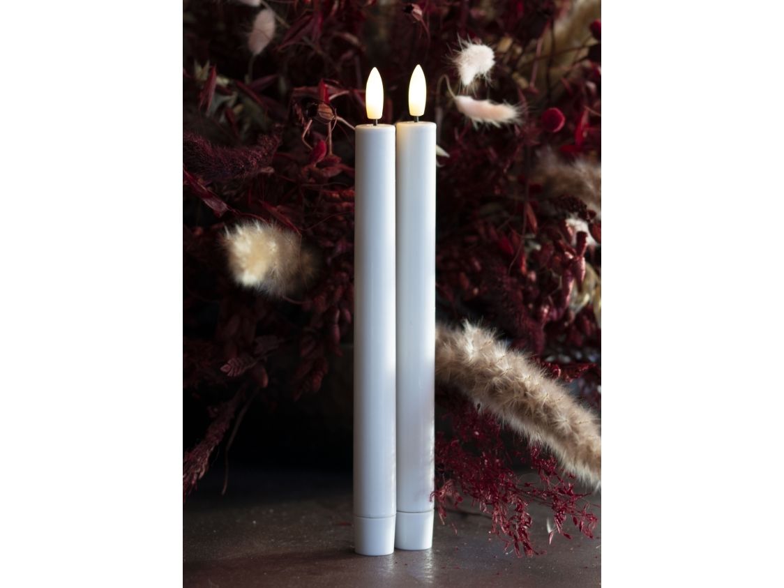 Der er ikke behov for batterier. Stearinlyset er lavet af rigtig stearin og tåler maks. 30 grader, pas på med direkte sollys. Kun til indendørs brug. Sirius stearinlyset er pakket i en flot gaveæske.