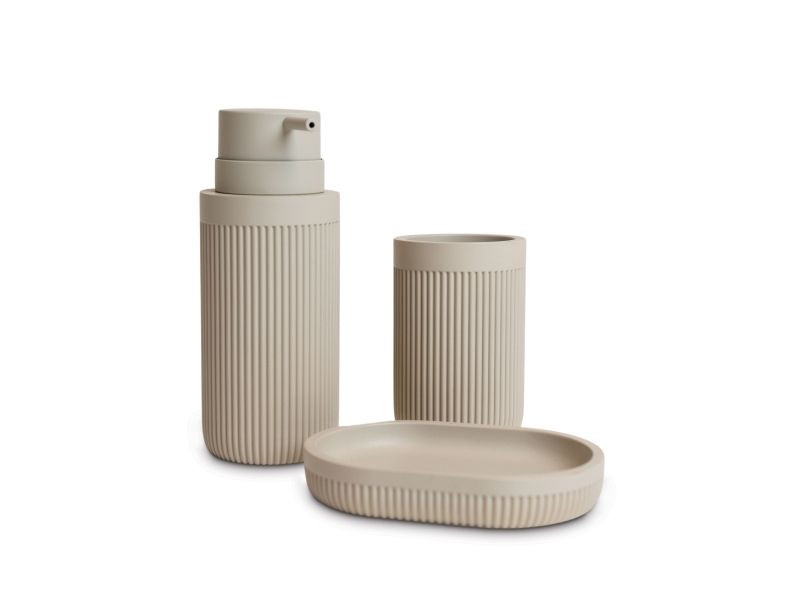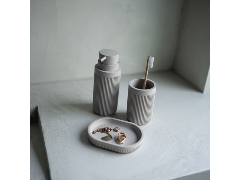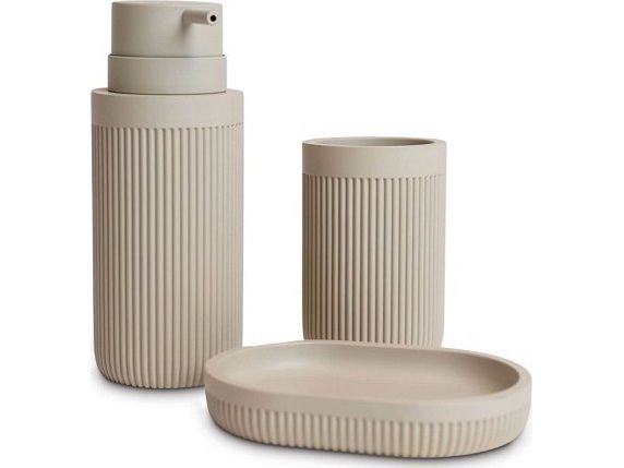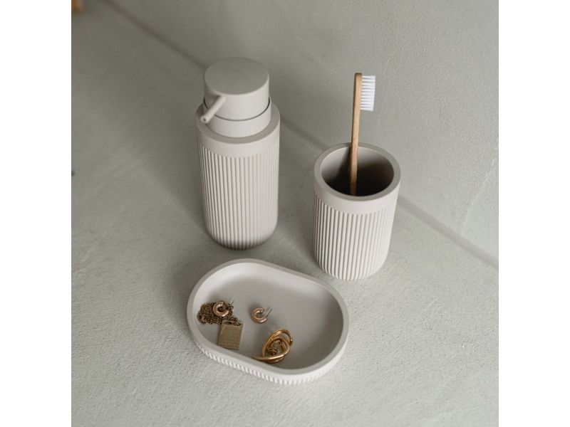 Dette sæt består af tre nøje udvalgte dele: en sæbedispenser, en tandbørstekrus og en alsidig sæbeskål, perfekt til både sæbe og smykker.