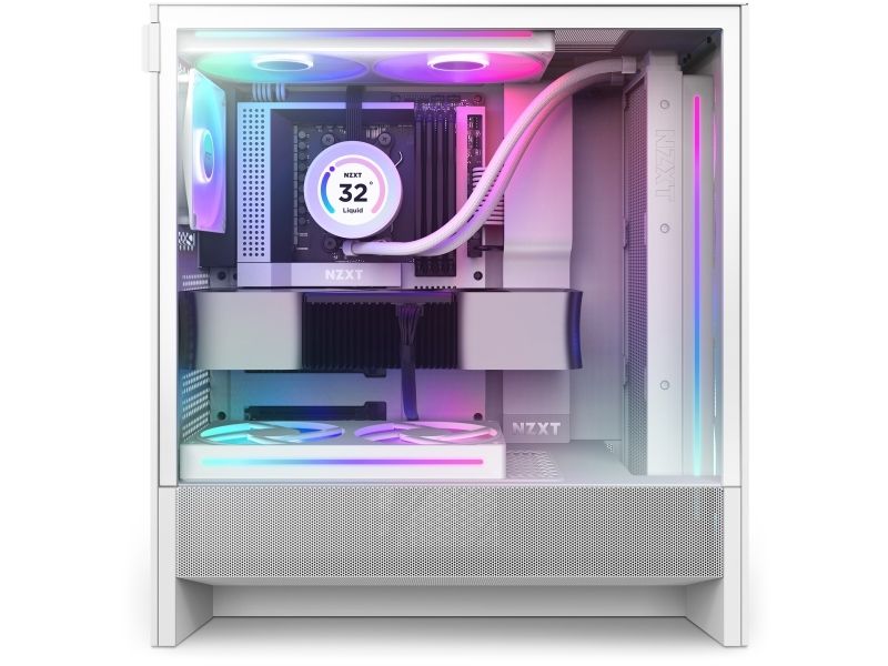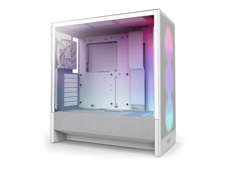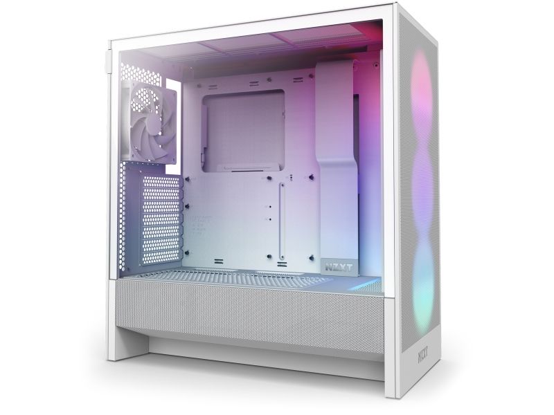 The NZXT H5 Flow RGB chassis is designed to provide a mid-tower form factor with practical features for gamers and PC builders alike. Its airflow-optimized mesh design enhances cooling performance while the included RGB fans add a vibrant touch to your setup. The side panels are toolless, making it easy to access components, and the cable management system with 28 mm clearance helps maintain a clean interior. With a windowed tempered-glass side panel, the NZXT H5 Flow RGB showcases internal components beautifully. It supports multiple internal bays, allowing for versatile storage options and accommodating long graphics cards up to 410 mm. The chassis also offers excellent cooling support with compatibility for various fan sizes, including a radiator for effective heat dissipation.