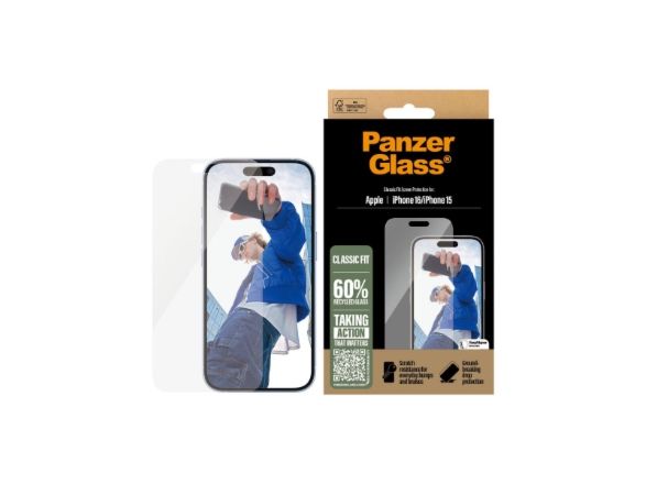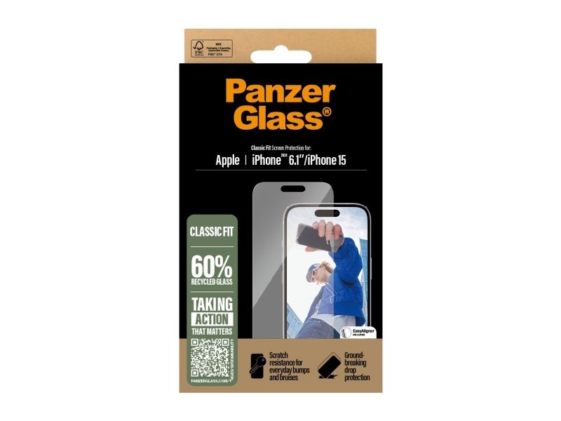 Want to protect your phone screen from the hazards of everyday life? Then this scratch, shock and drop-resistant PanzerGlass screen protector is your knight in shining armor. It's made of 60% recycled glass and will shield your phone screen from accidental bumps against sharp-edged dangers and crushing falls onto stone-hard pavements. And to top it all off, it has a smudge-free coating that reduces traces of fingerprints and grease to give you a clear screen view. The enclosed EasyAligner made of 100% recycled plastic makes installation a piece of cake (seriously!). To make it even easier, we've included step-by-step instructions as well as a QR code for quick access to our online how-to video. And remember: Once installed, you'll never again fear your phone falling screen-first. This might not happen, but then again … it might! This screen protection prolongs the lifetime of your phone so that one day you can pass it on to someone else who will love it just as much as you do. It's the new circle of phone life and one way of working toward a more sustainable future. Another is to use less packaging: In 2024, we reduced the amount of paper in our PanzerGlass core product packaging design by an average of 66 %*. So, of course, this product comes in a recyclable FSC-certified box. The screen protector is Classic Fit, meaning it covers the active part of your screen. For extra phone protection, combine the screen protection with a PanzerGlass protective case, for example, a fearlessly fashionable case from CARE by PanzerGlass , and a PanzerGlass PicturePerfect or Hoops camera lens protector. *Reduction from 2022-2024 measured by comparing selected products from the PanzerGlass core range.