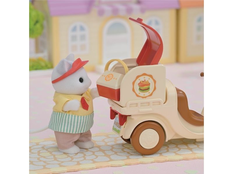 This box contains a hamburger-shaped trolley, a delivery scooter and Latte Cat father. The hamburger can be disassembled and transformed into a stand, table and seats. Inside the stand, you'll find everything you need to prepare burgers and fries. The scooter can be used on its own or connected to the trolley. The delivery box can be removed to create a seat.