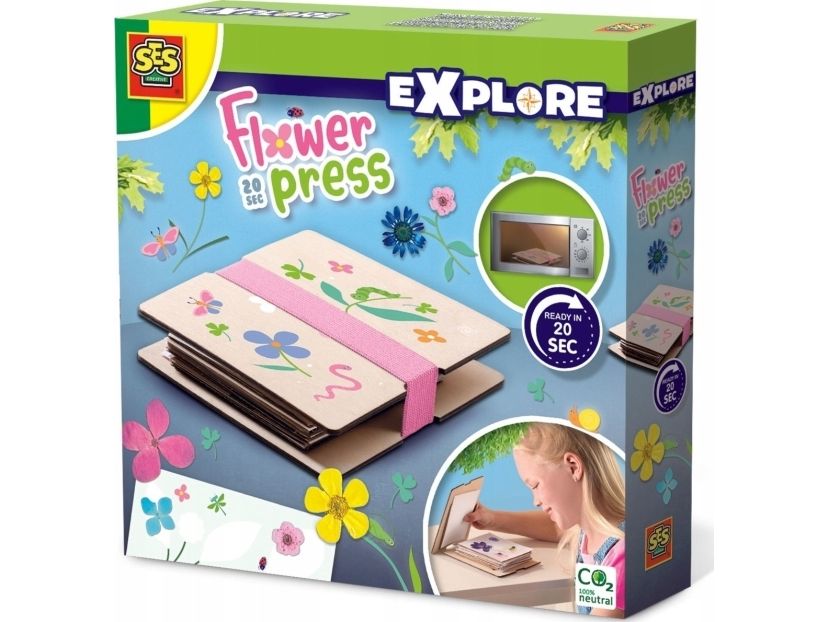 Pick the most beautiful flowers you can find and press them! With this flower press, you won't have to wait long for beautiful dried flowers. Since the flower press can go in the microwave, you can admire your dried flowers after just 20 seconds. Look for the prettiest flowers and leaves in your garden or neighbourhood and create beautiful works of art. With this flower press, you don't have to wait long to get crafting with your dried flowers!SES Creative Flower press 20 sec. - Dried flowers, without the wait, Can be used in microwave, Age 5+. Product type: Children's craft kit, Recommended age (min): 5 yr(s), Material: Cardboard. Number of pieces: 3 pc(s), Packaging content: Flower press Sticky sheets for flowers (in instruction booklet) Instructions. Package type: Box