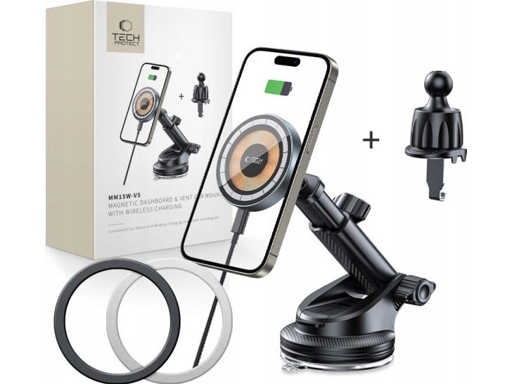 Tech-Protect MM15W MagSafe bilholder med 15 W induktiv lader for frontrutegrill og dashbord - svart