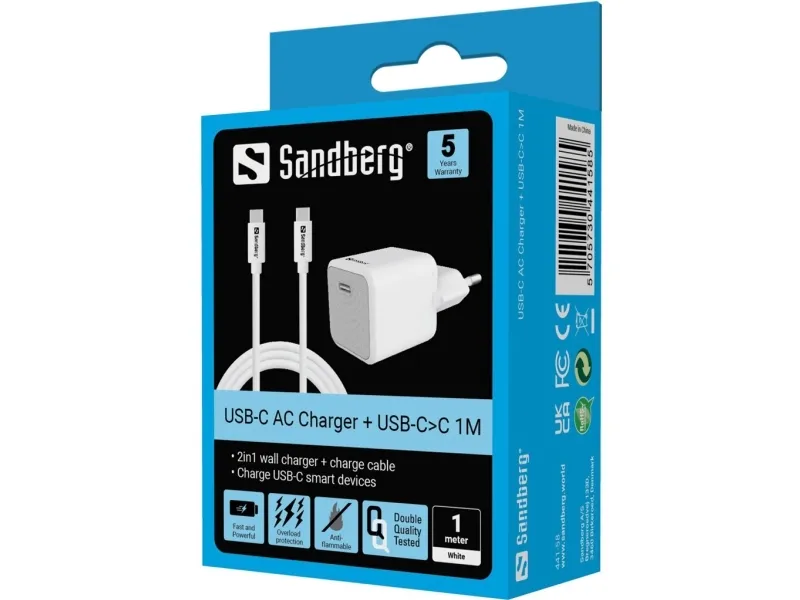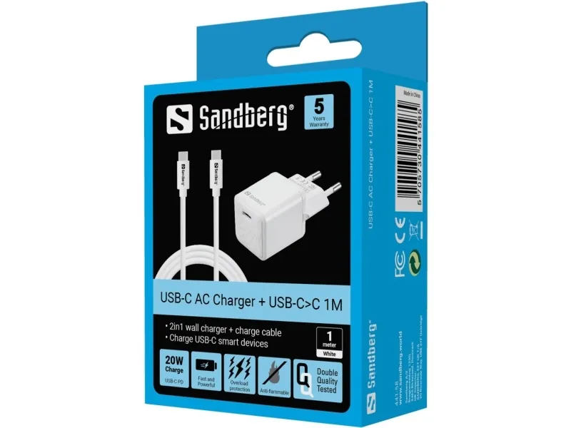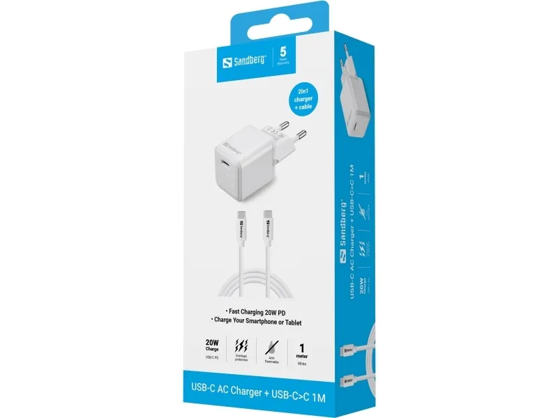Sandberg USB-C AC charger +USB-C>C 1M is a handy charger for sockets. It is equipped with a USB-C 20W PD output, so you can charge smartphones and tablets at full speed.